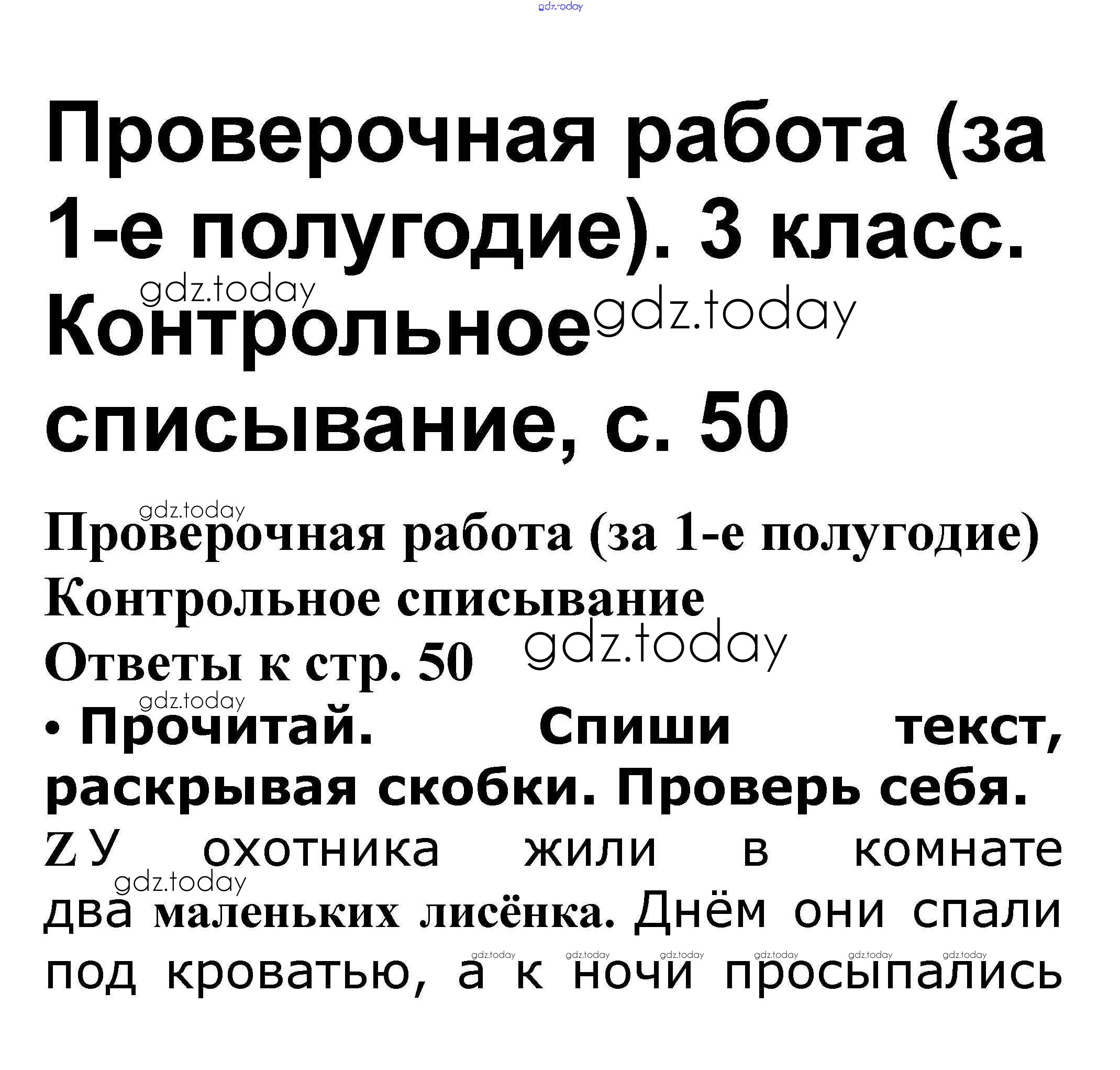 На страницах сайта gdz.today вы найдете учебный и вспомогательный материал, направленный на улучшения знаний школьной программы. ГДЗ - онлайн мир знаний Проверочная работа (за 1-е полугодие) Контрольное списывание стр. 50 Проверочным работам по Русскому языку для 3 класса Канакина, Щеголева Просвещение Школа России 2018