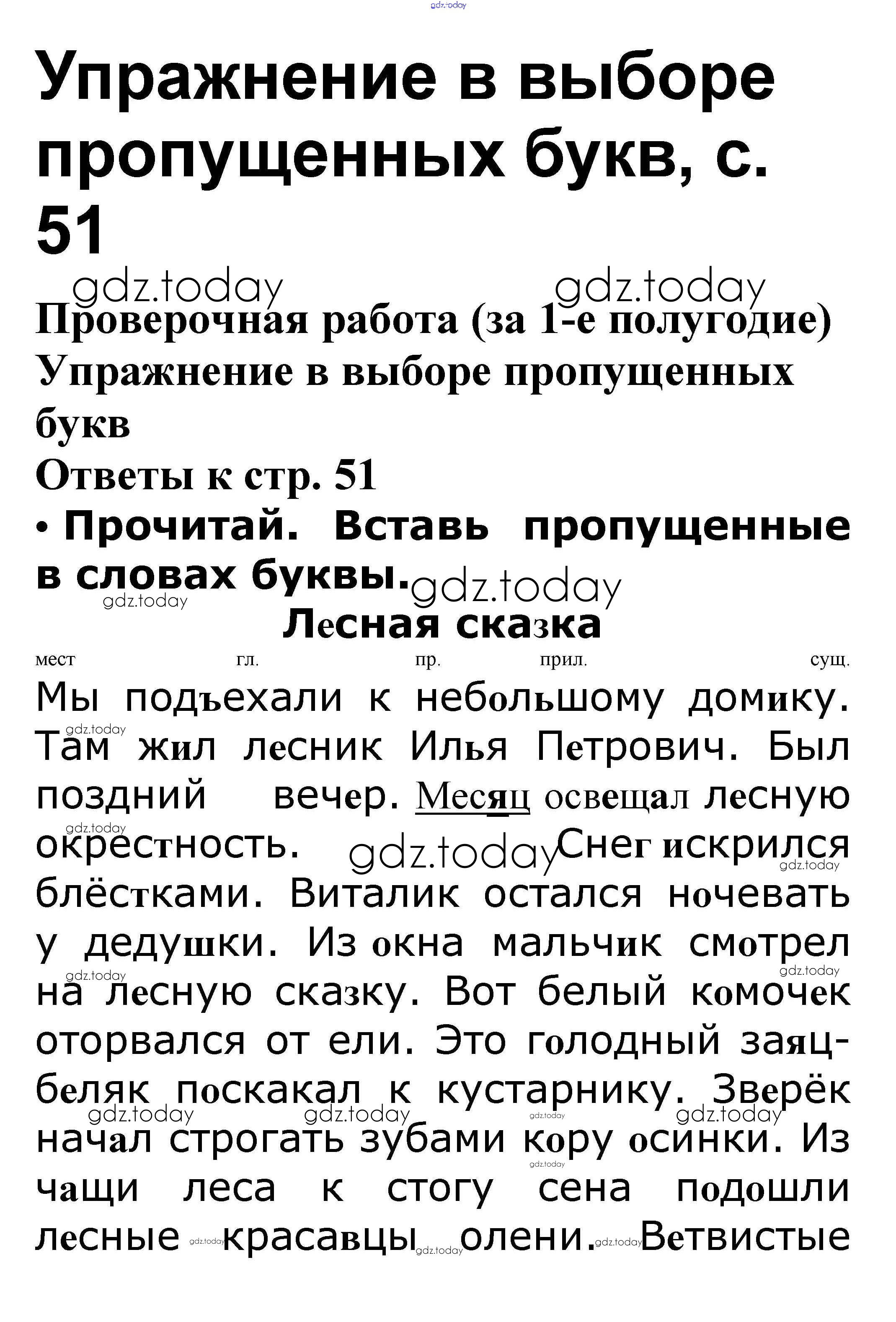 На страницах сайта gdz.today вы найдете учебный и вспомогательный материал, направленный на улучшения знаний школьной программы. ГДЗ - онлайн мир знаний Проверочная работа (за 1-е полугодие) Упражнение в выборе пропущенных букв стр. 51 Проверочным работам по Русскому языку для 3 класса Канакина, Щеголева Просвещение Школа России 2018