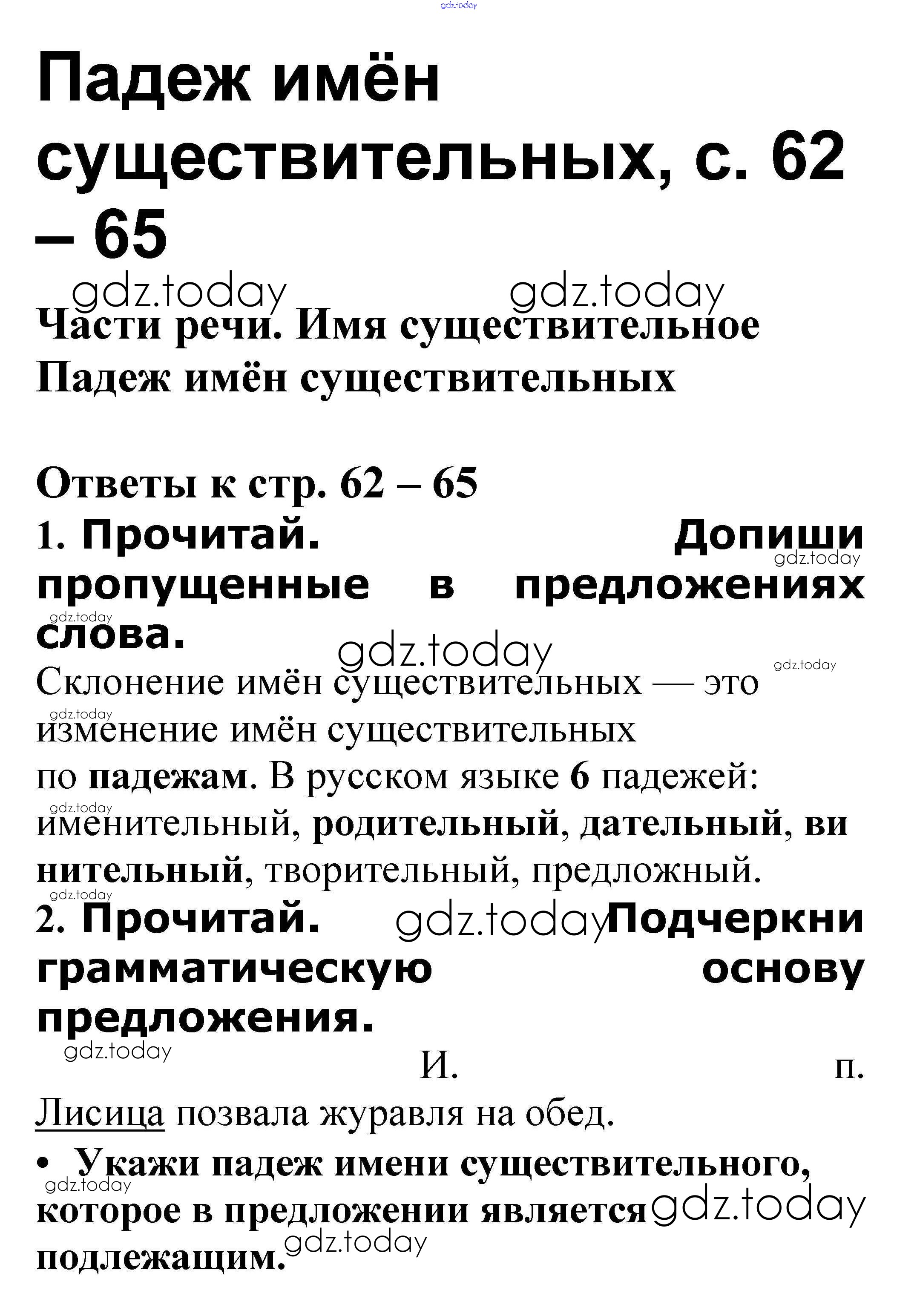 На страницах сайта gdz.today вы найдете учебный и вспомогательный материал, направленный на улучшения знаний школьной программы. ГДЗ - онлайн мир знаний Решение к теме "Части речи. Имя существительное" Падеж имён существительных стр. 62 – 65 Проверочным работам по Русскому языку для 3 класса Канакина, Щеголева Просвещение Школа России 2018