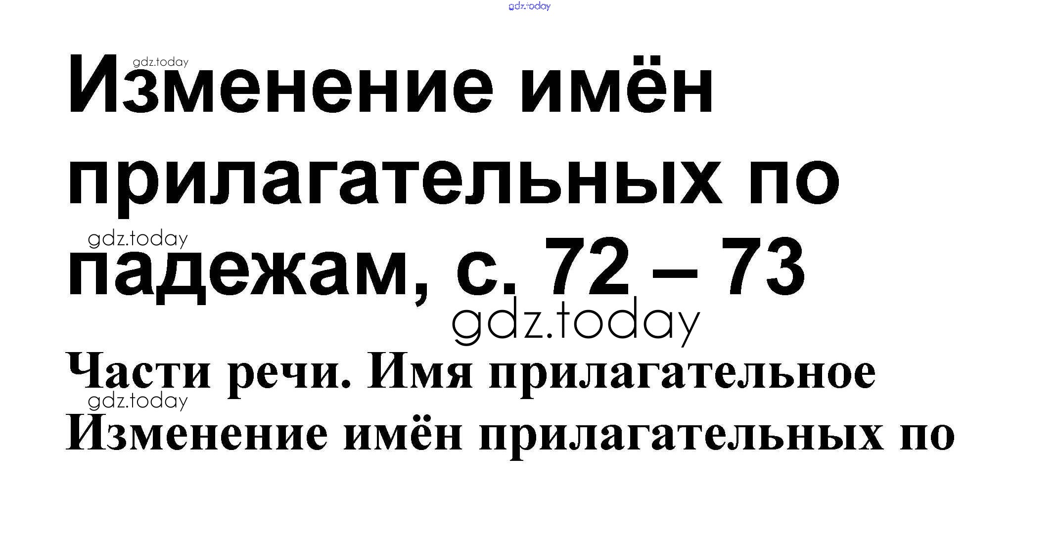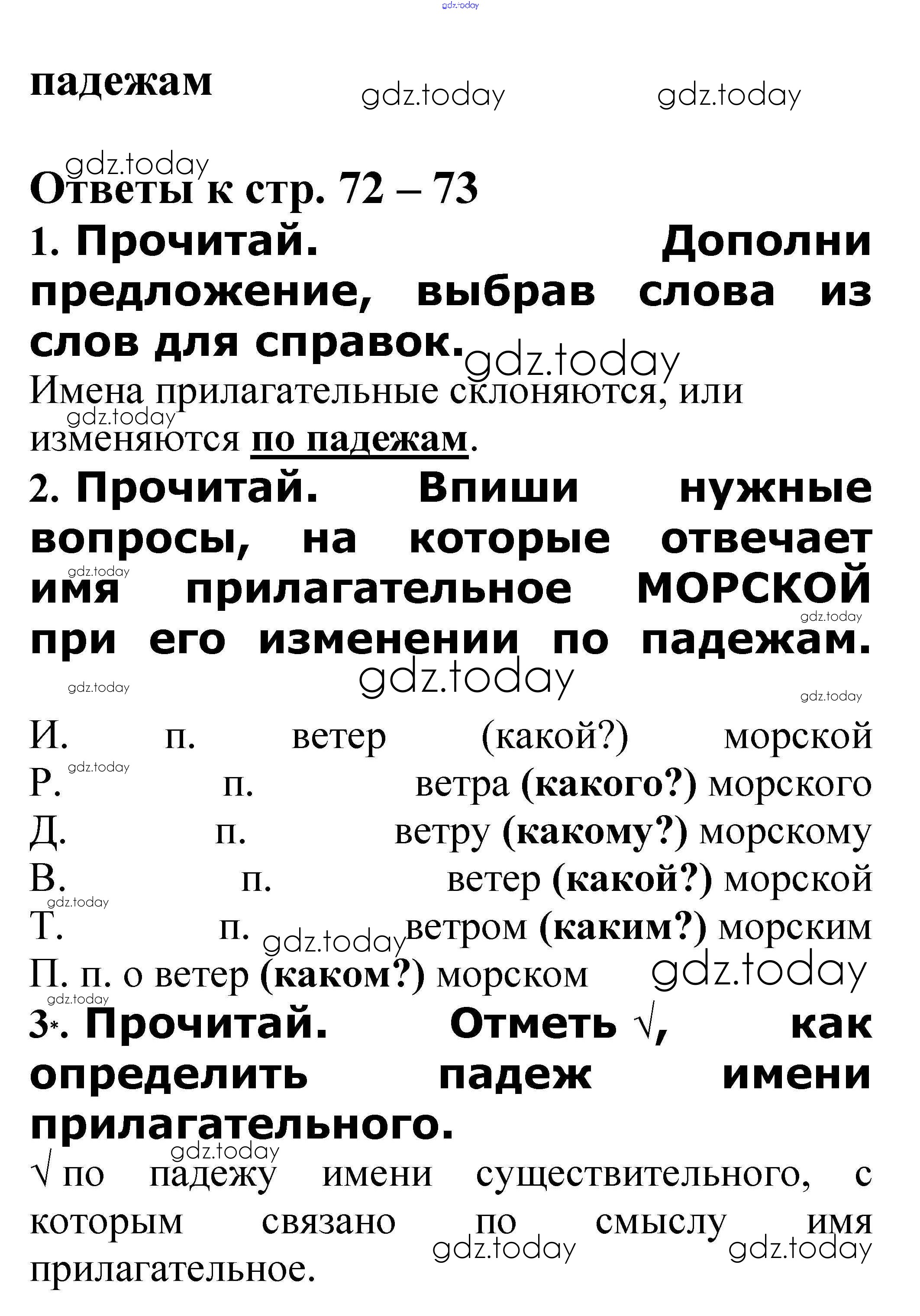 На страницах сайта gdz.today вы найдете учебный и вспомогательный материал, направленный на улучшения знаний школьной программы. ГДЗ - онлайн мир знаний Решение к теме "Имя прилагательное" Изменение имён прилагательных по падежам стр. 72 – 73 Проверочным работам по Русскому языку для 3 класса Канакина, Щеголева Просвещение Школа России 2018