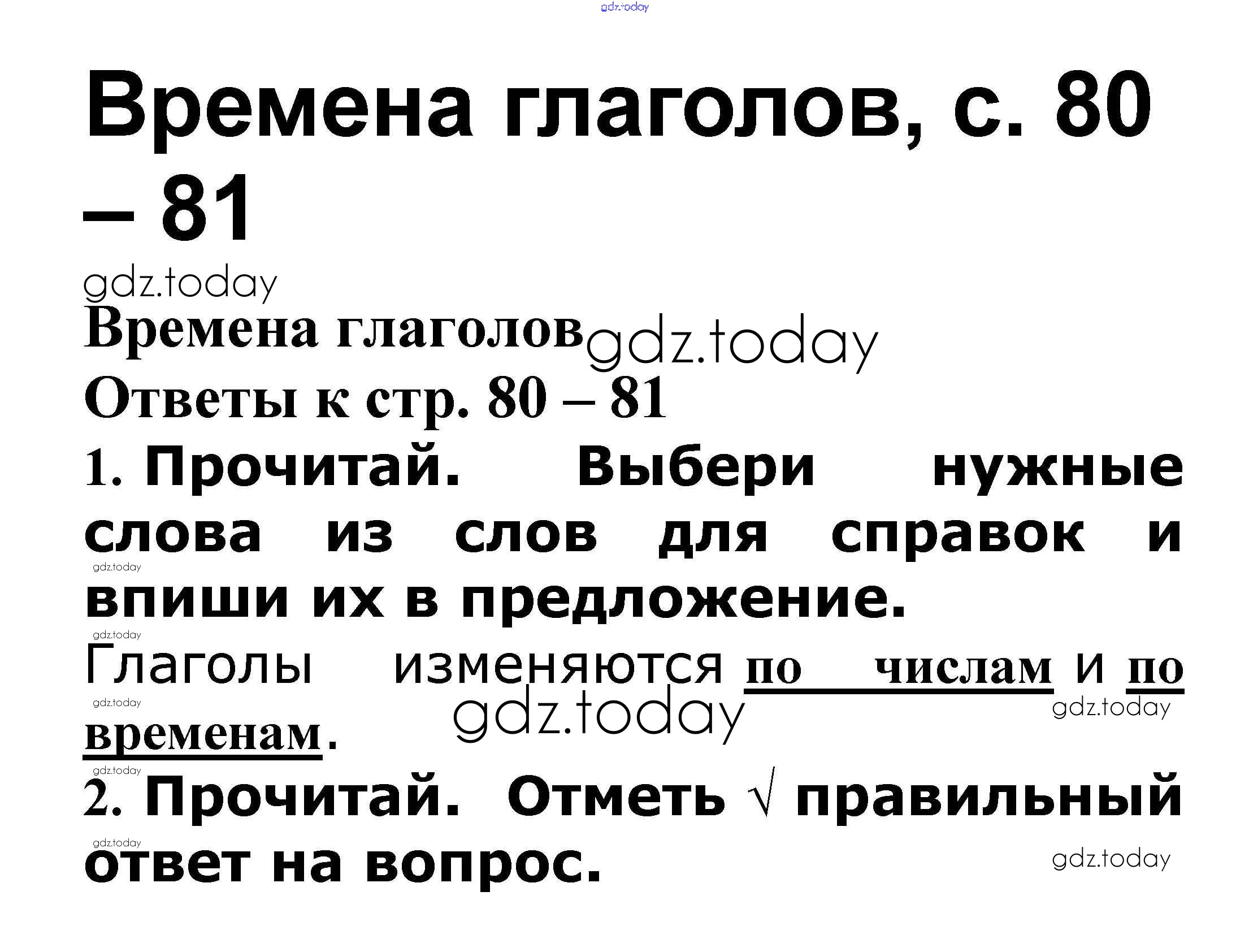 На страницах сайта gdz.today вы найдете учебный и вспомогательный материал, направленный на улучшения знаний школьной программы. ГДЗ - онлайн мир знаний Решение к теме "Глагол" Времена глаголов стр. 80 – 81 Проверочным работам по Русскому языку для 3 класса Канакина, Щеголева Просвещение Школа России 2018