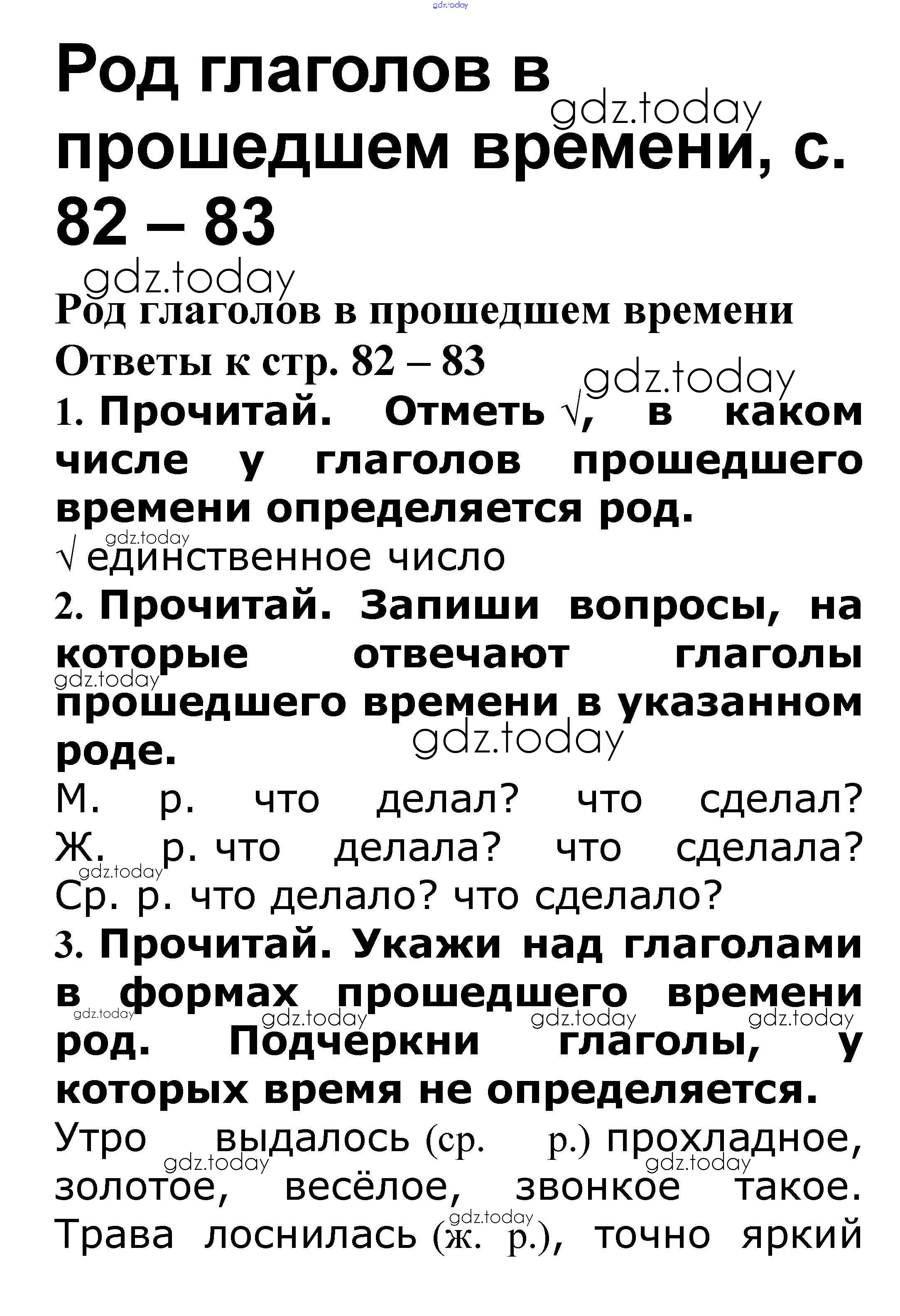 На страницах сайта gdz.today вы найдете учебный и вспомогательный материал, направленный на улучшения знаний школьной программы. ГДЗ - онлайн мир знаний Решение к теме "Глагол" Род глаголов в прошедшем времени стр. 82 – 83 Проверочным работам по Русскому языку для 3 класса Канакина, Щеголева Просвещение Школа России 2018