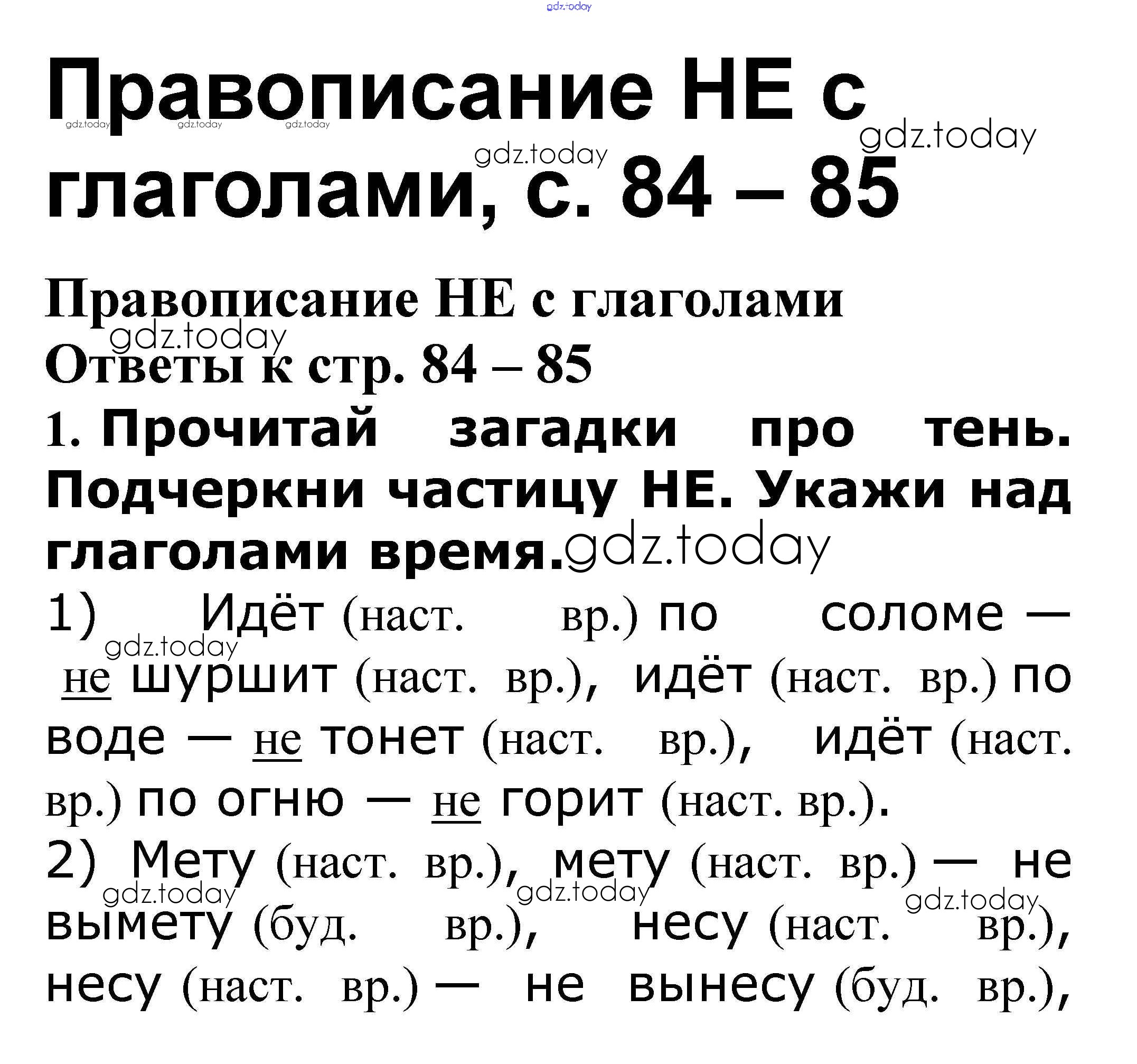 На страницах сайта gdz.today вы найдете учебный и вспомогательный материал, направленный на улучшения знаний школьной программы. ГДЗ - онлайн мир знаний Решение к теме "Глагол" Правописание НЕ с глаголами стр. 84 – 85 Проверочным работам по Русскому языку для 3 класса Канакина, Щеголева Просвещение Школа России 2018