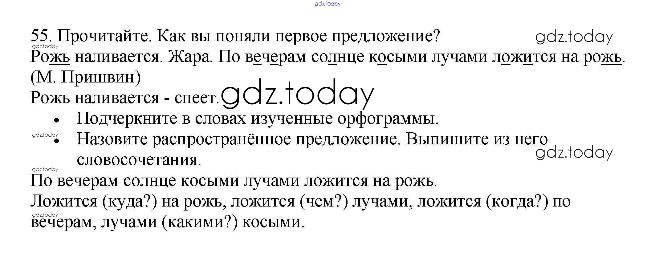 На страницах сайта gdz.today вы найдете учебный и вспомогательный материал, направленный на улучшения знаний школьной программы. ГДЗ - онлайн мир знаний Часть 2. Решение к упражнениям 55 Рабочей тетради по Русскому языку для 3 класса Канакина Просвещение Школа России 2012