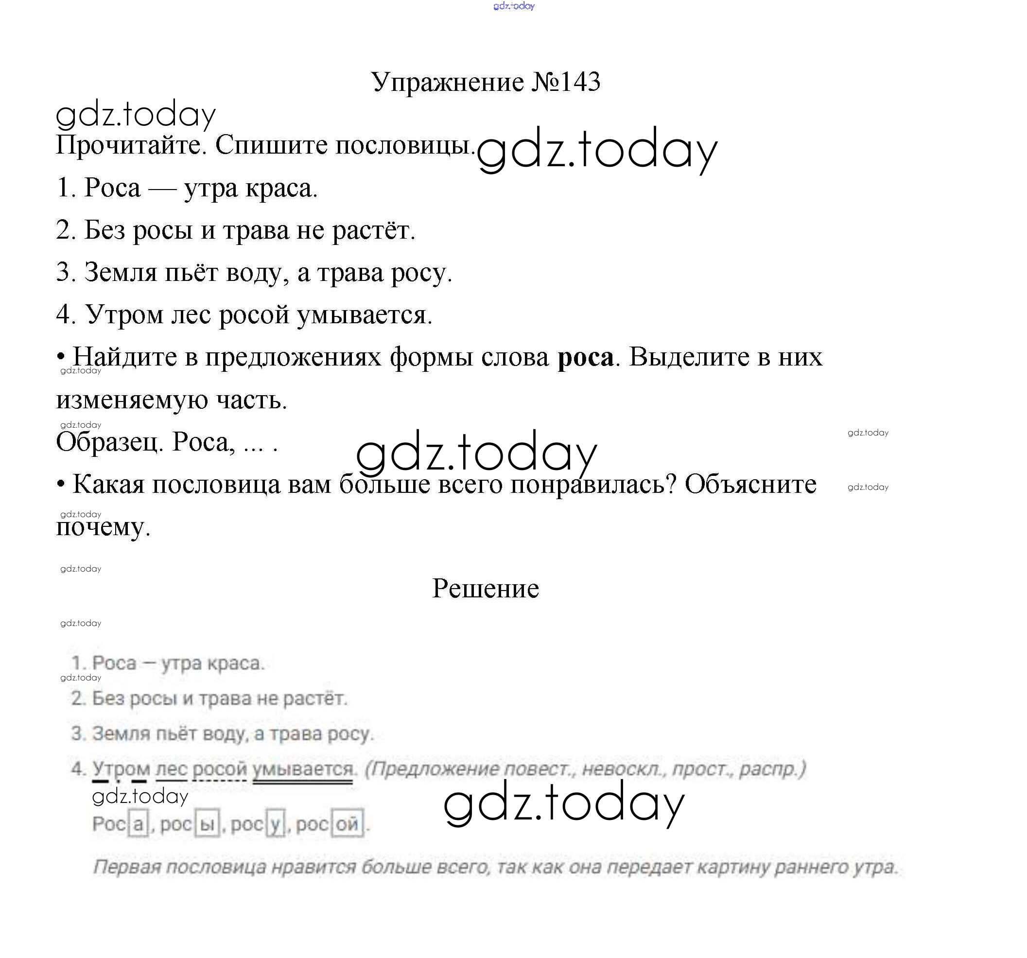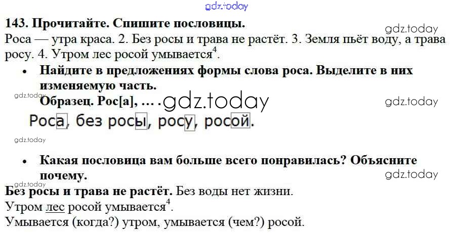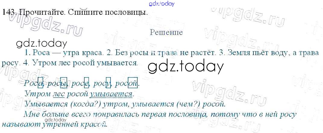 На страницах сайта gdz.today вы найдете учебный и вспомогательный материал, направленный на улучшения знаний школьной программы. ГДЗ - онлайн мир знаний Упражнения Часть 1 143 Учебнику по Русскому языку для 3 класса Канакина, Горецкий Просвещение Школа России 2013