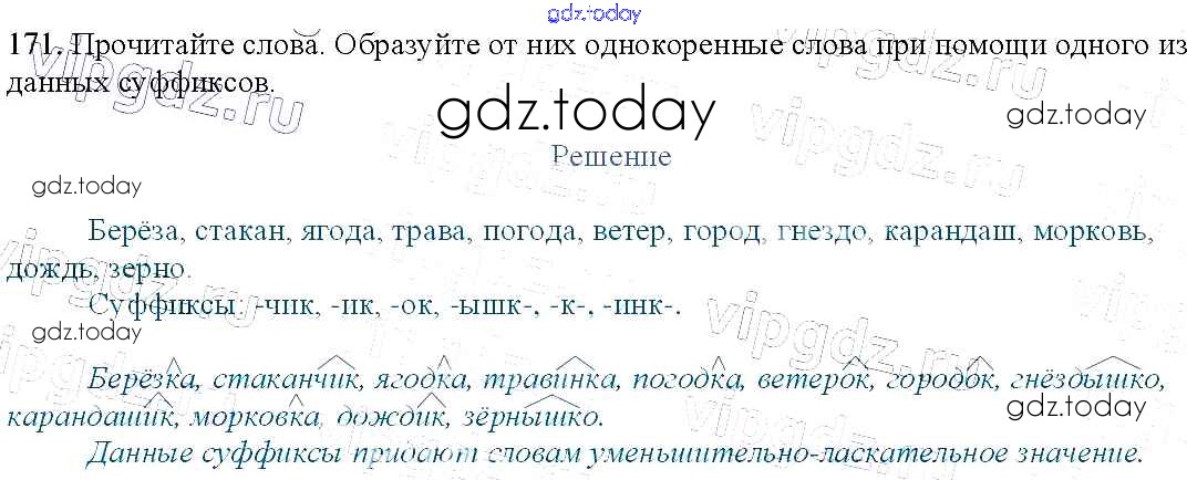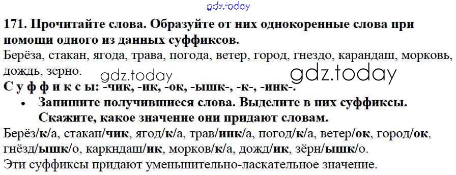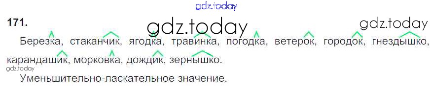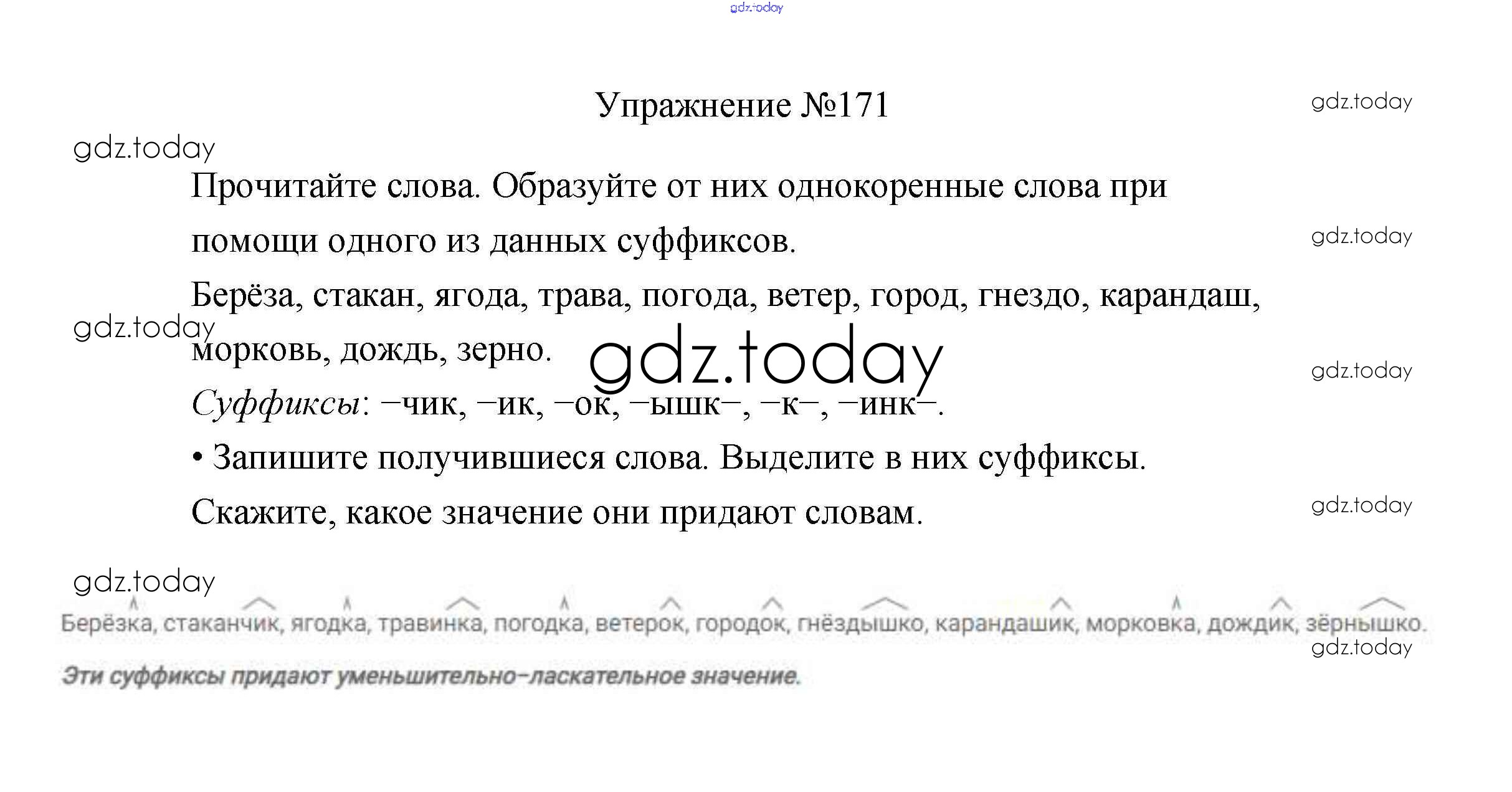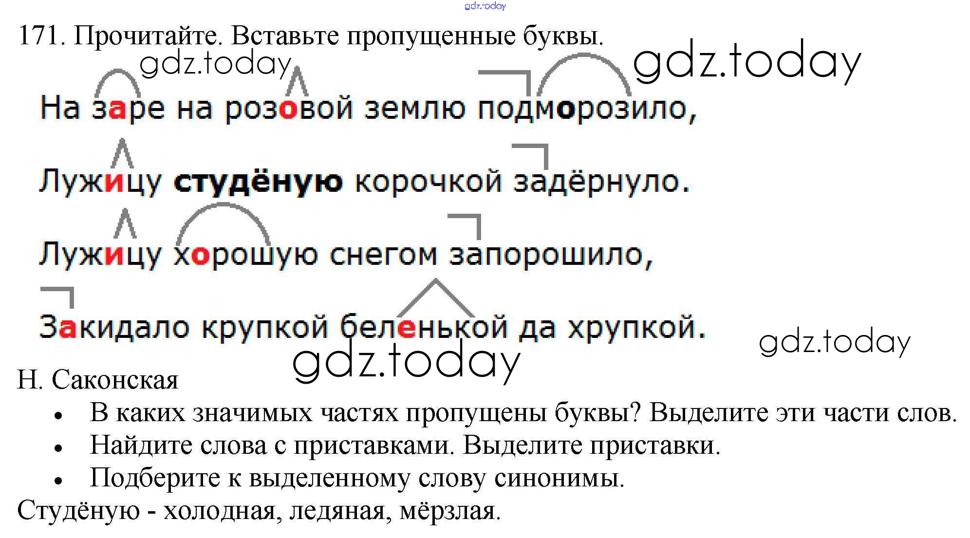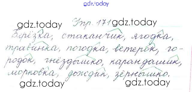 На страницах сайта gdz.today вы найдете учебный и вспомогательный материал, направленный на улучшения знаний школьной программы. ГДЗ - онлайн мир знаний Упражнения Часть 1 171 Учебнику по Русскому языку для 3 класса Канакина, Горецкий Просвещение Школа России 2013