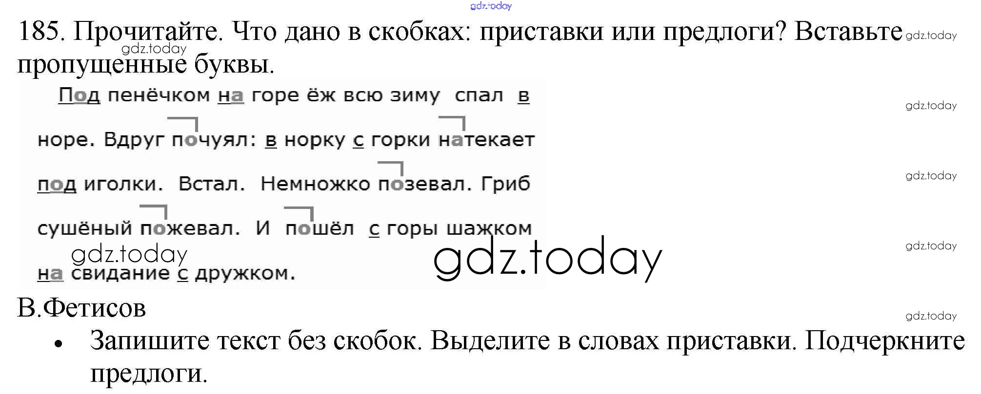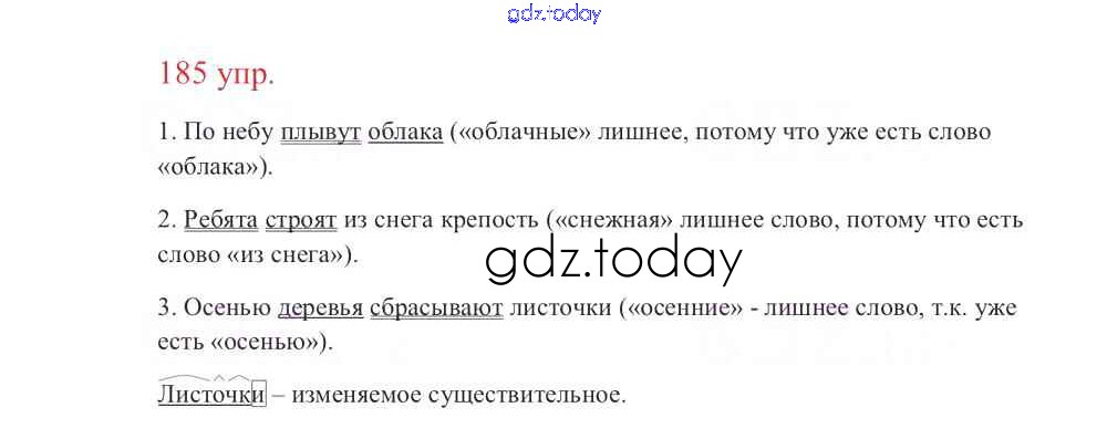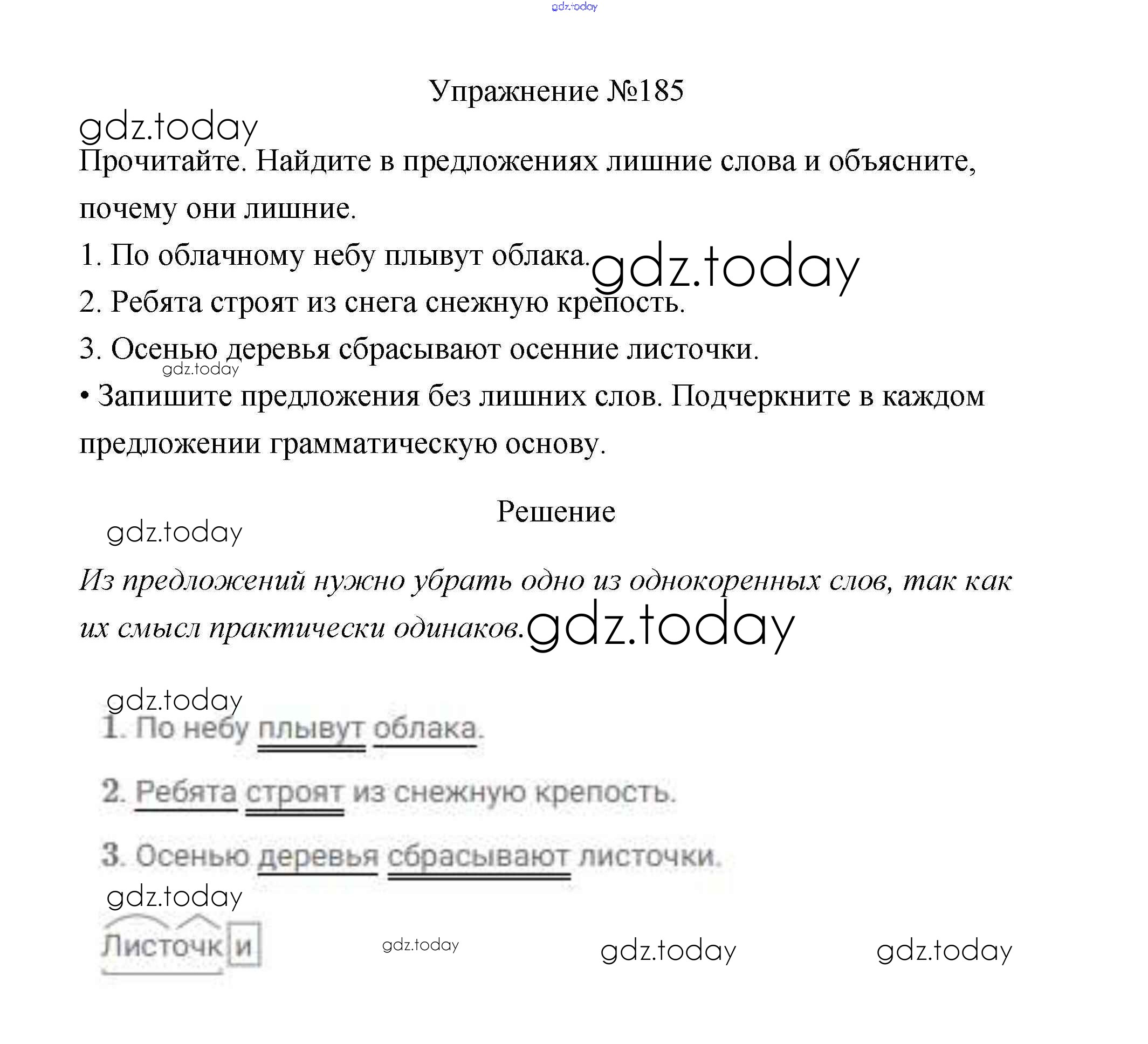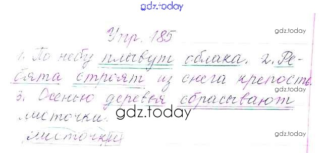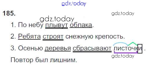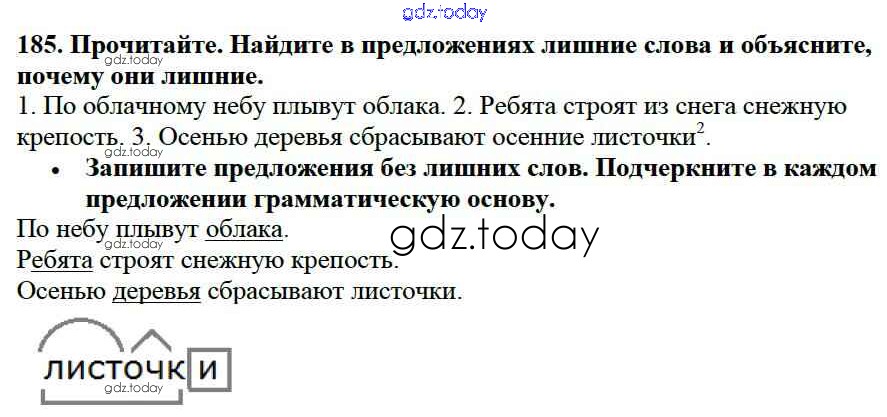 На страницах сайта gdz.today вы найдете учебный и вспомогательный материал, направленный на улучшения знаний школьной программы. ГДЗ - онлайн мир знаний Упражнения Часть 1 185 Учебнику по Русскому языку для 3 класса Канакина, Горецкий Просвещение Школа России 2013