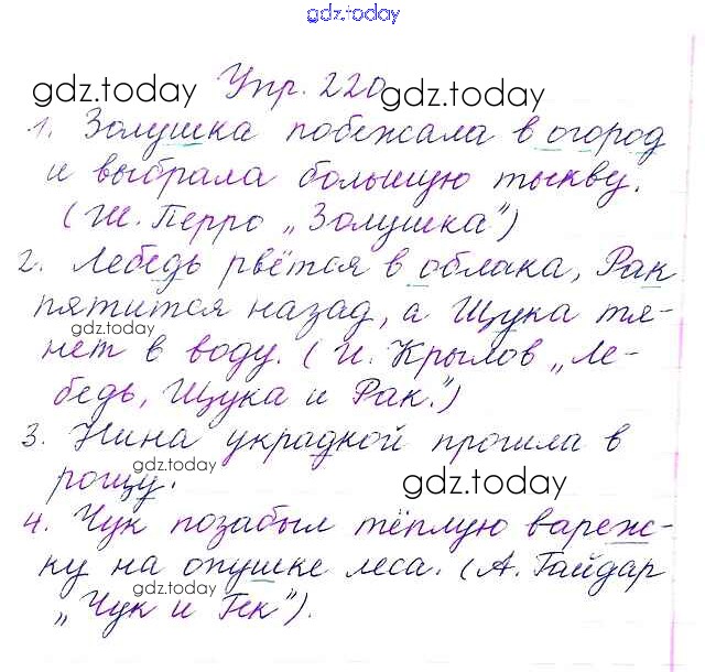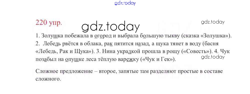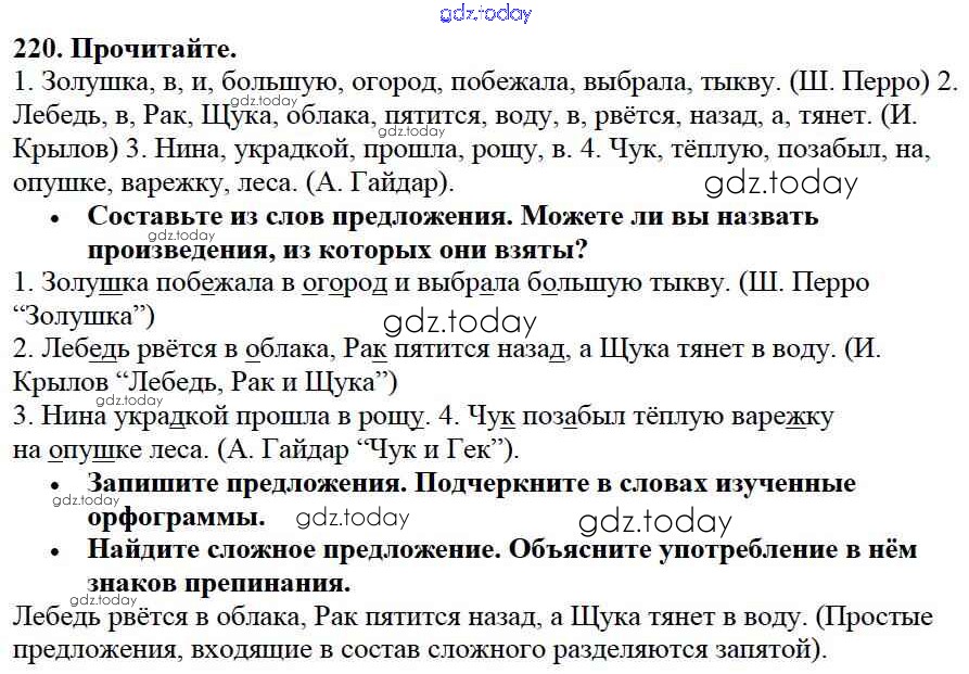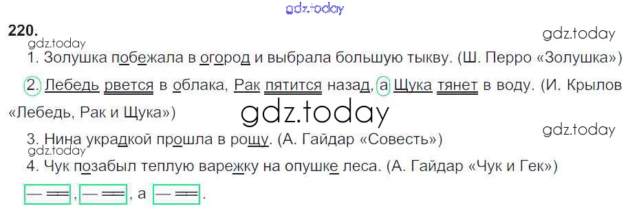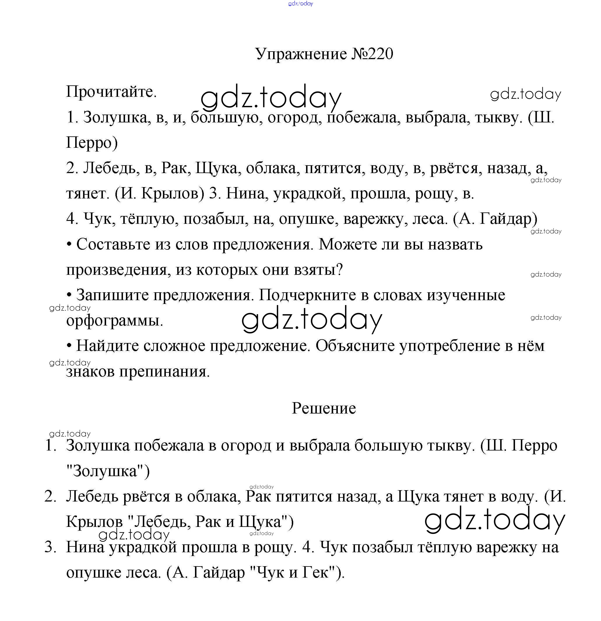 На страницах сайта gdz.today вы найдете учебный и вспомогательный материал, направленный на улучшения знаний школьной программы. ГДЗ - онлайн мир знаний Упражнения Часть 1 220 Учебнику по Русскому языку для 3 класса Канакина, Горецкий Просвещение Школа России 2013