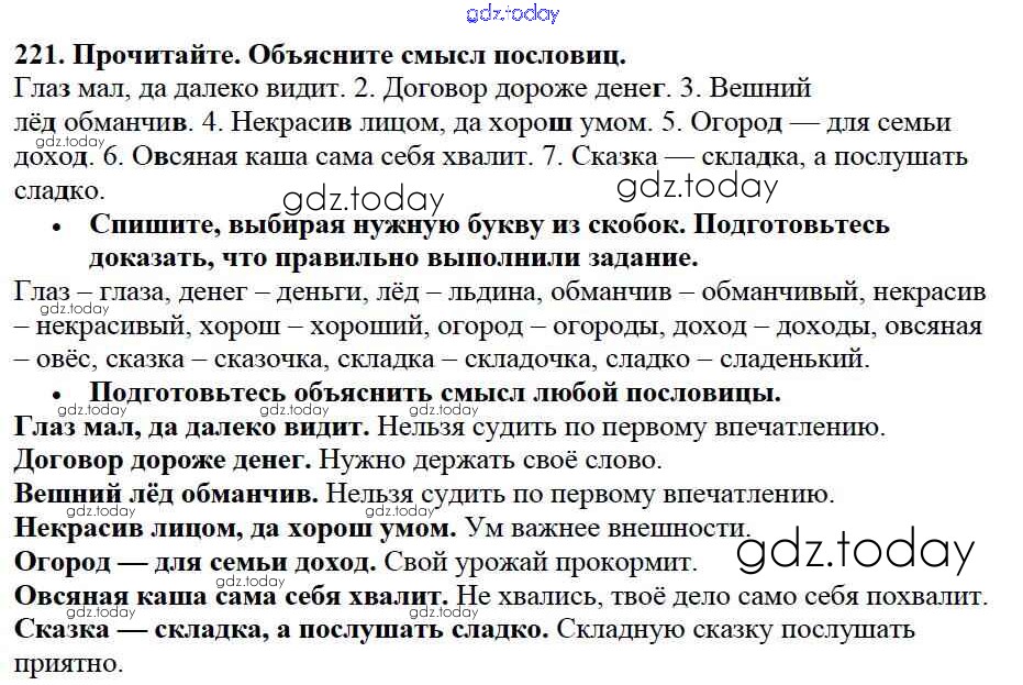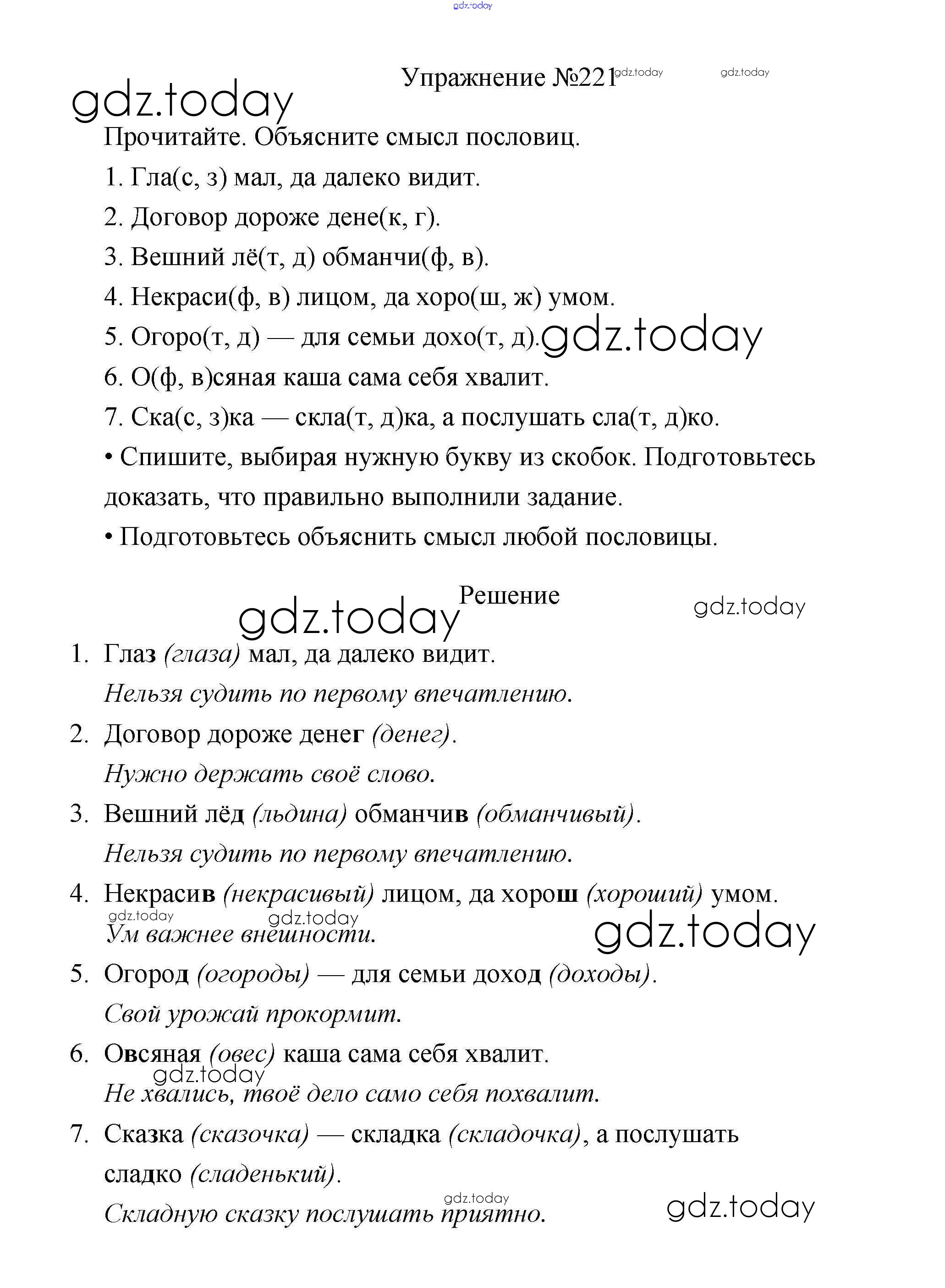 На страницах сайта gdz.today вы найдете учебный и вспомогательный материал, направленный на улучшения знаний школьной программы. ГДЗ - онлайн мир знаний Упражнения Часть 1 221 Учебнику по Русскому языку для 3 класса Канакина, Горецкий Просвещение Школа России 2013