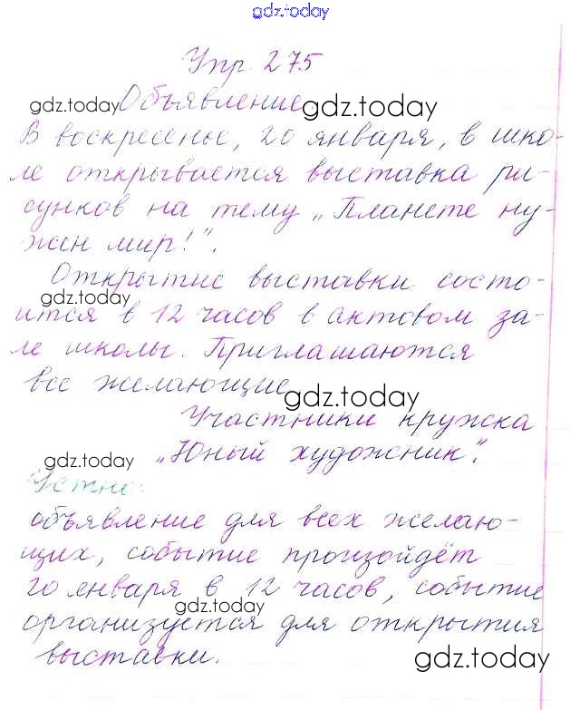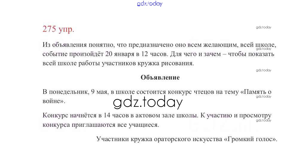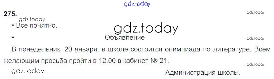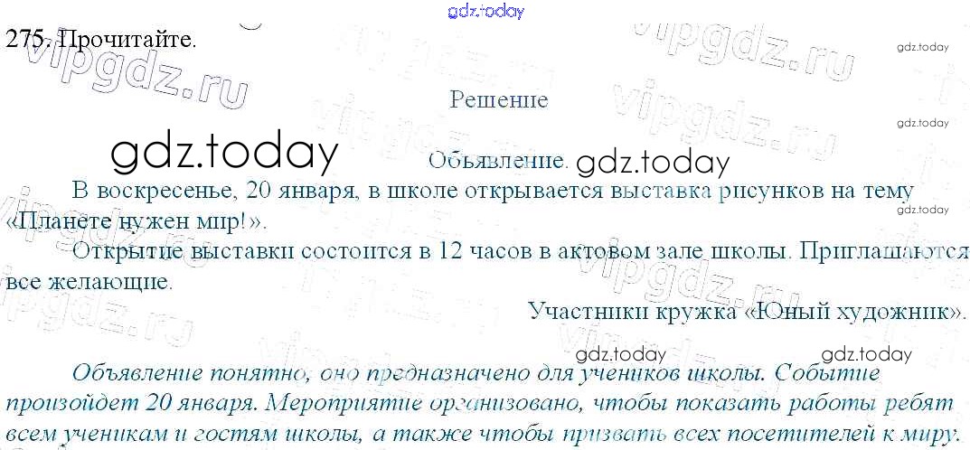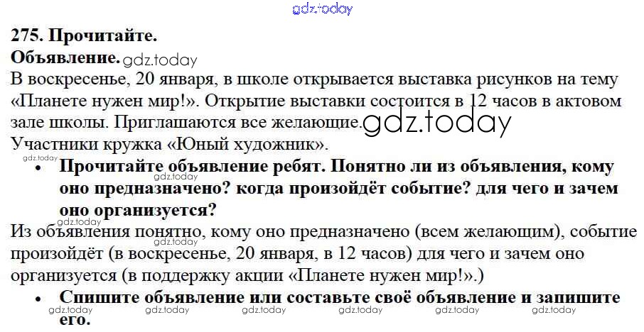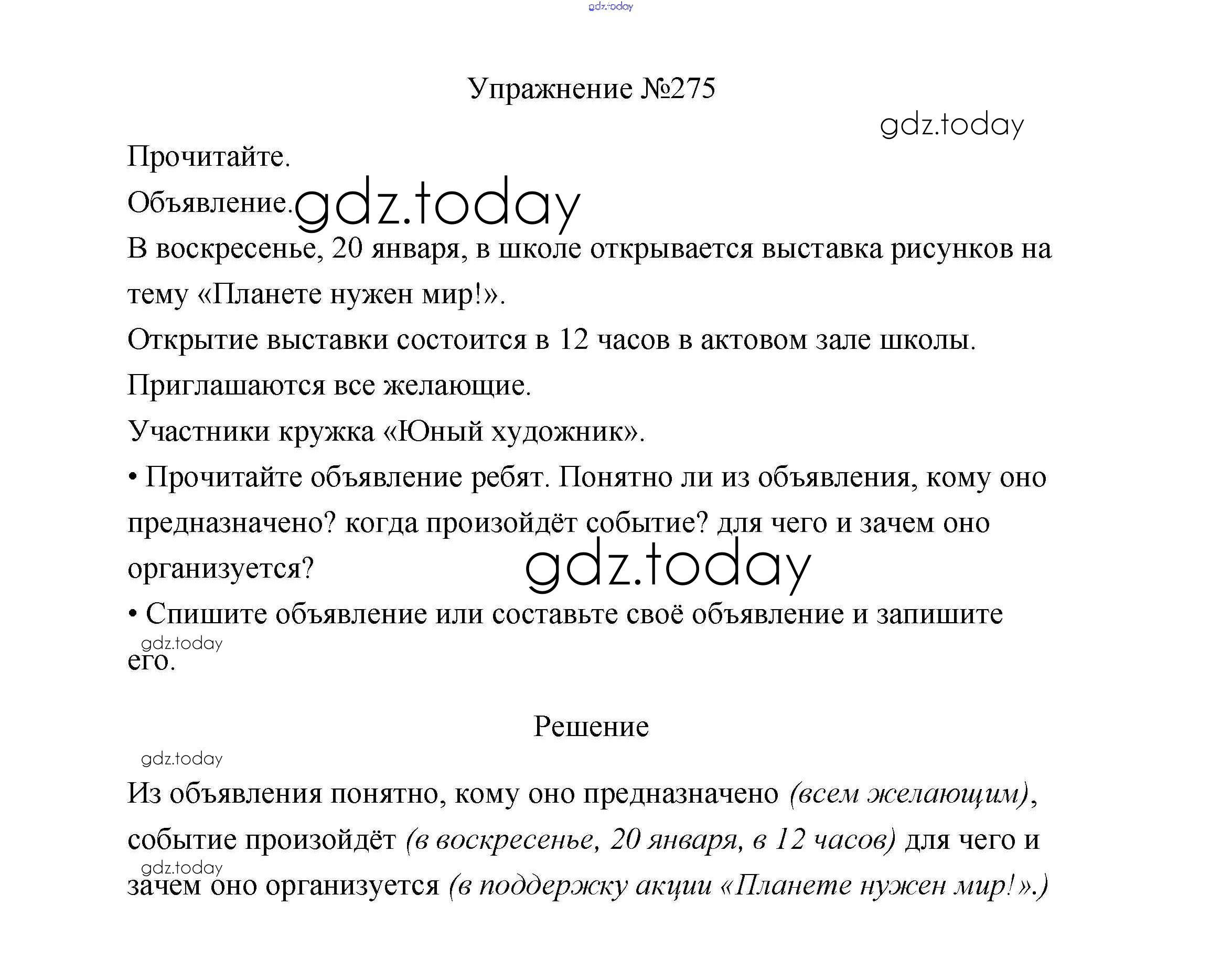 На страницах сайта gdz.today вы найдете учебный и вспомогательный материал, направленный на улучшения знаний школьной программы. ГДЗ - онлайн мир знаний Упражнения Часть 1 275 Учебнику по Русскому языку для 3 класса Канакина, Горецкий Просвещение Школа России 2013