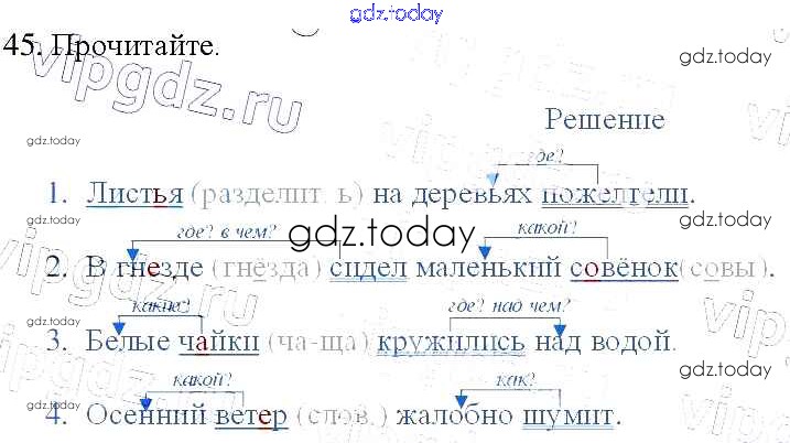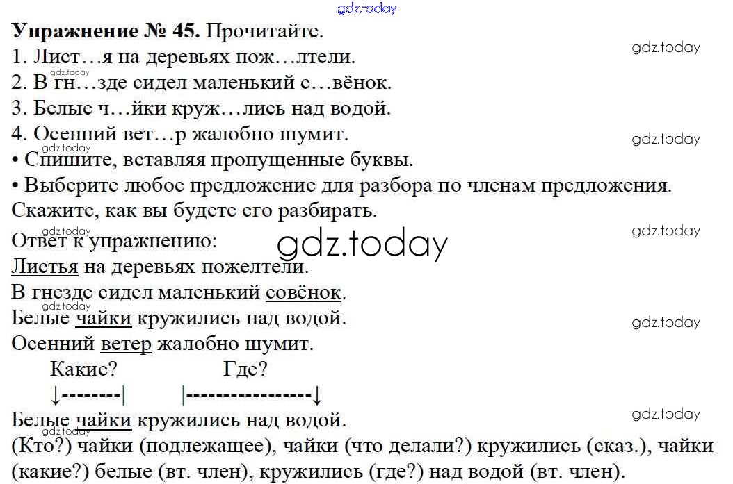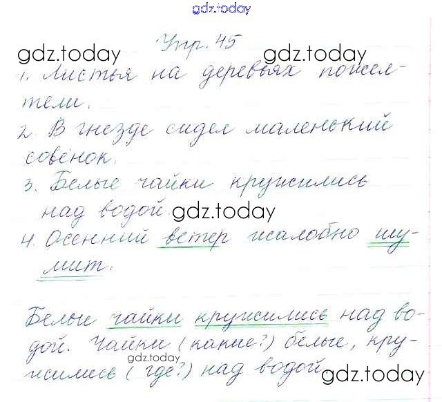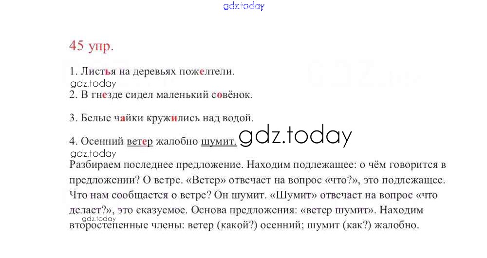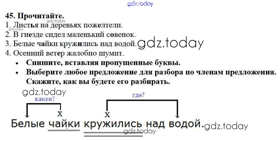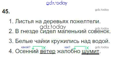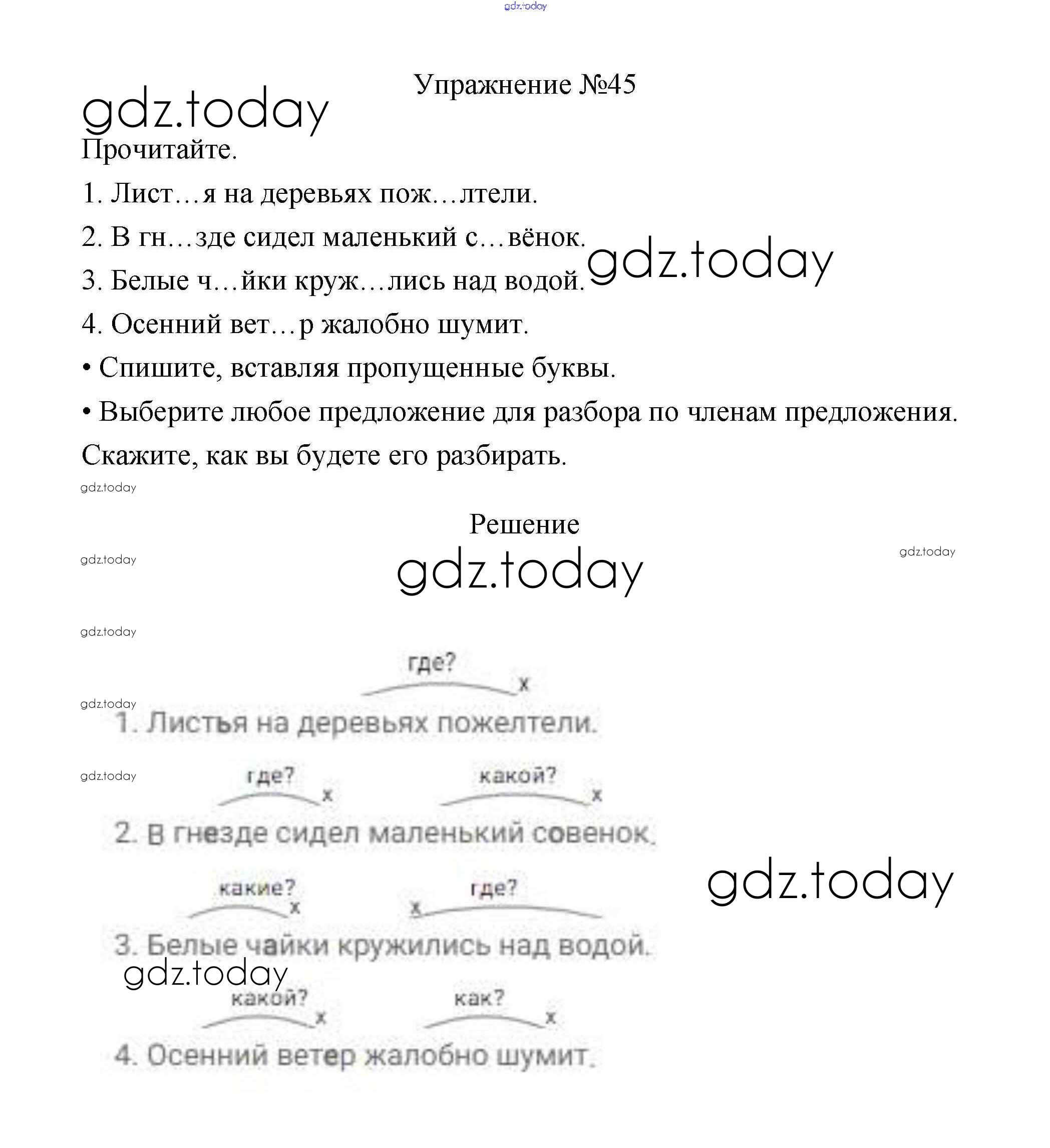 На страницах сайта gdz.today вы найдете учебный и вспомогательный материал, направленный на улучшения знаний школьной программы. ГДЗ - онлайн мир знаний Упражнения Часть 1 45 Учебнику по Русскому языку для 3 класса Канакина, Горецкий Просвещение Школа России 2013