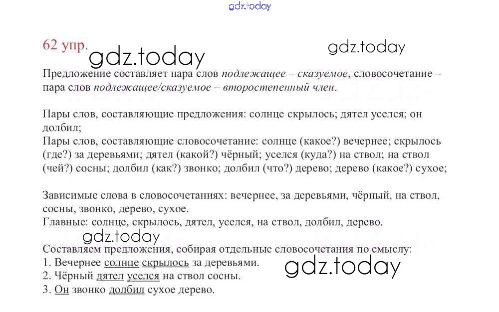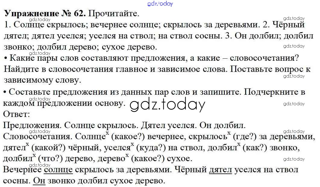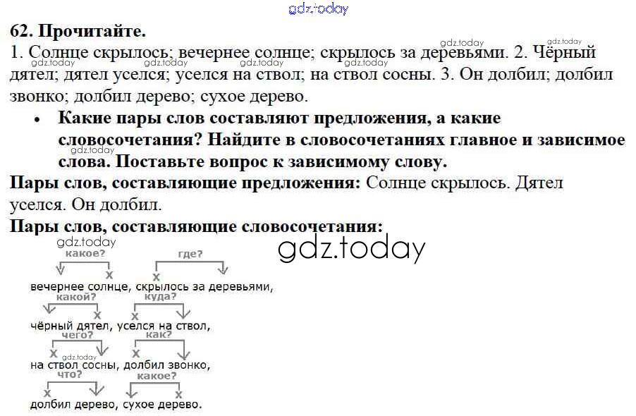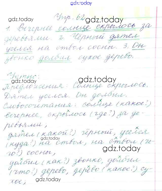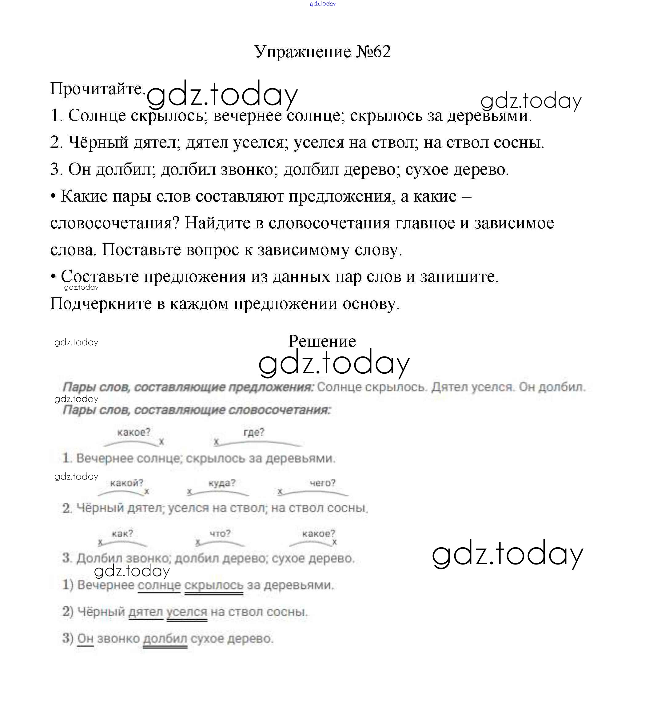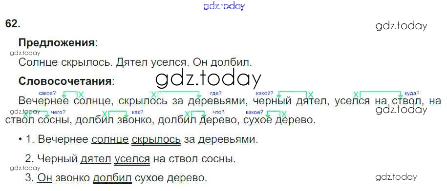 На страницах сайта gdz.today вы найдете учебный и вспомогательный материал, направленный на улучшения знаний школьной программы. ГДЗ - онлайн мир знаний Упражнения Часть 1 62 Учебнику по Русскому языку для 3 класса Канакина, Горецкий Просвещение Школа России 2013
