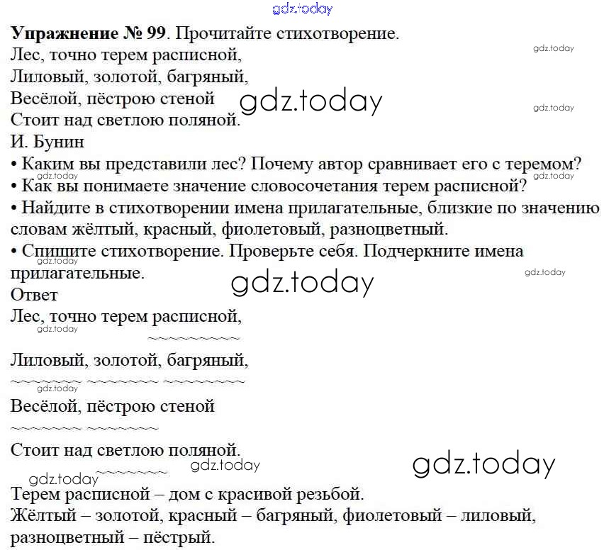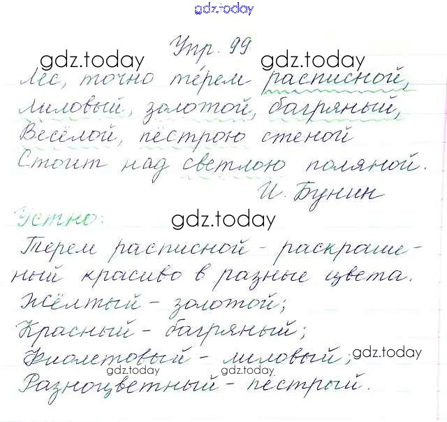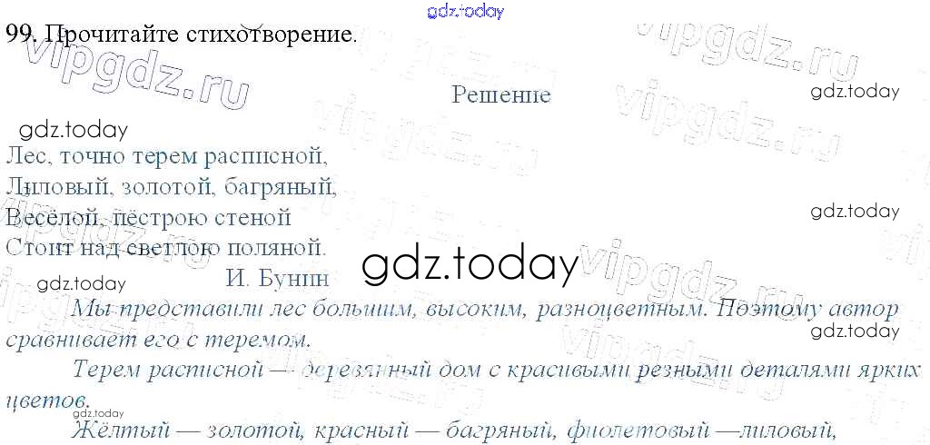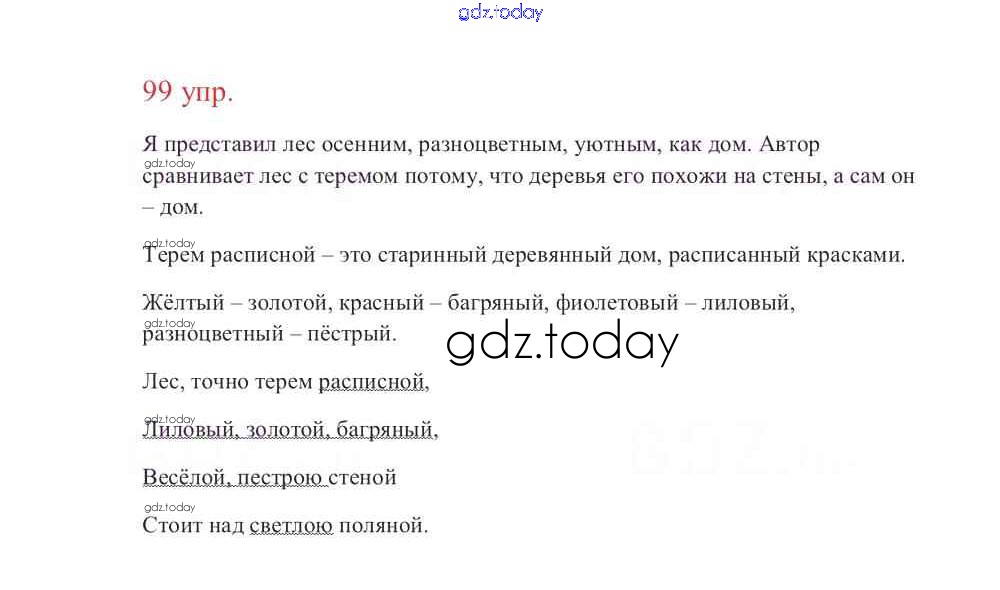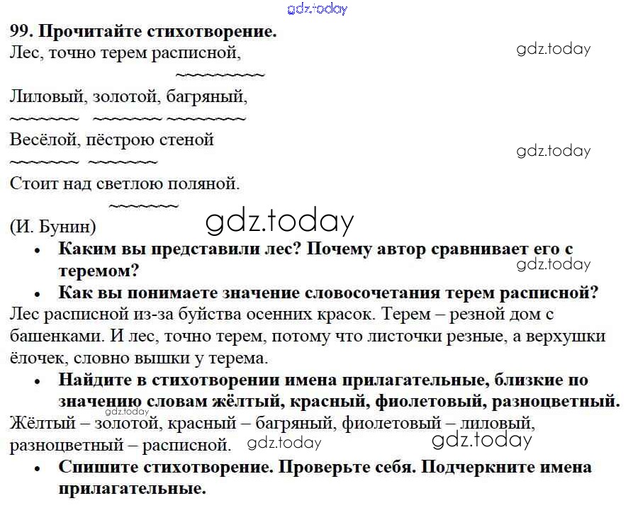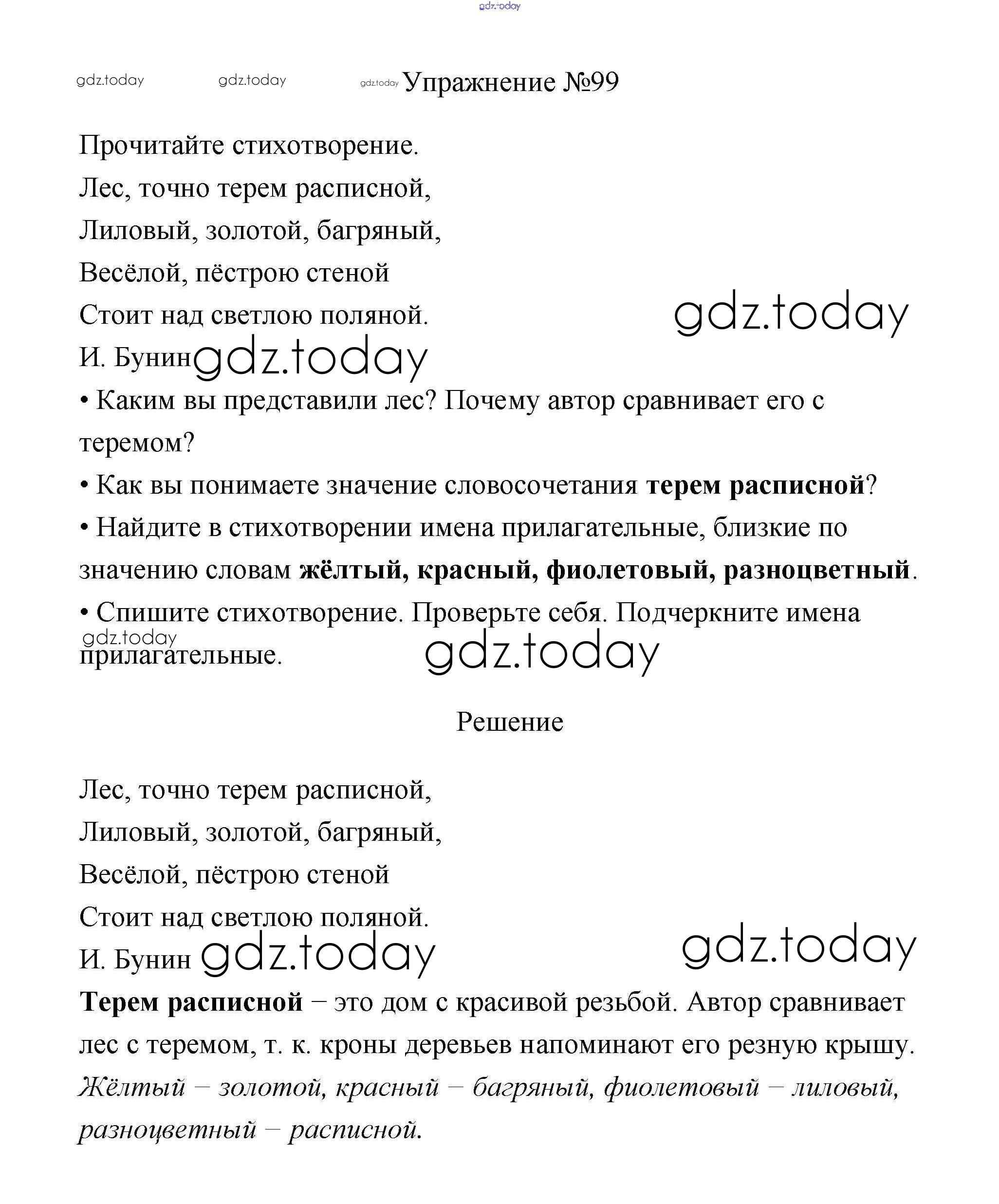 На страницах сайта gdz.today вы найдете учебный и вспомогательный материал, направленный на улучшения знаний школьной программы. ГДЗ - онлайн мир знаний Упражнения Часть 1 99 Учебнику по Русскому языку для 3 класса Канакина, Горецкий Просвещение Школа России 2013