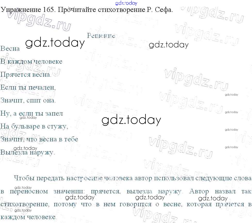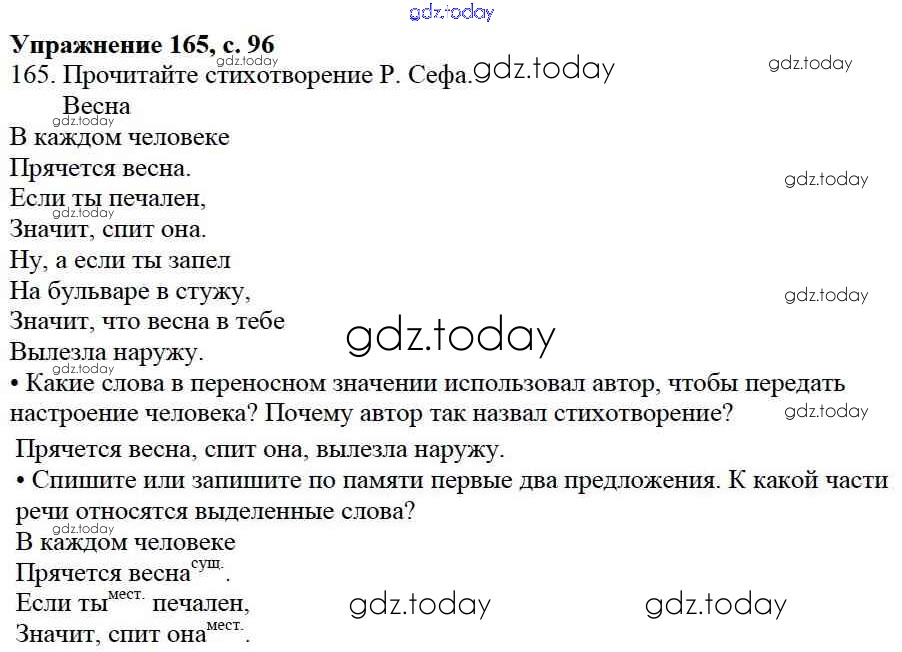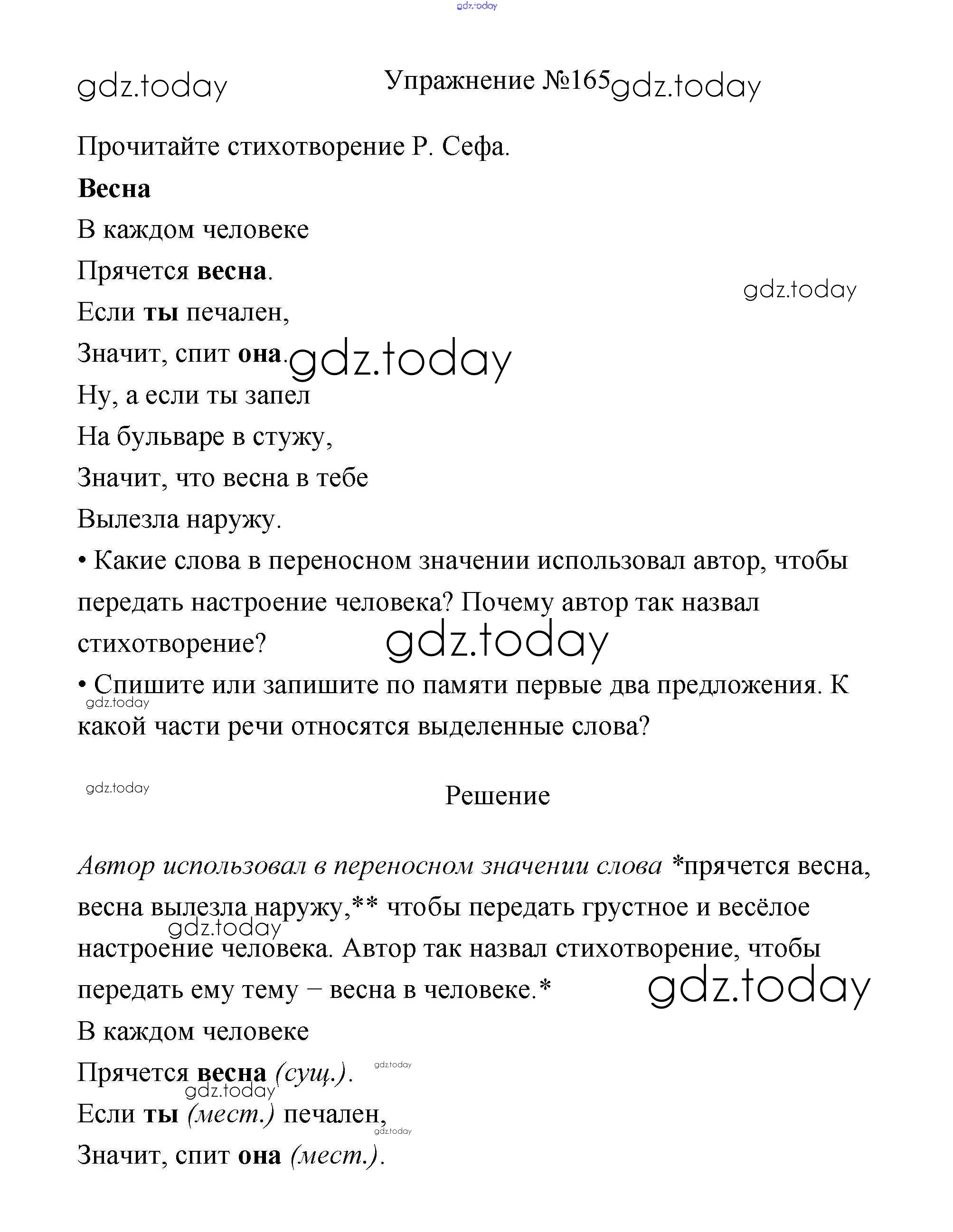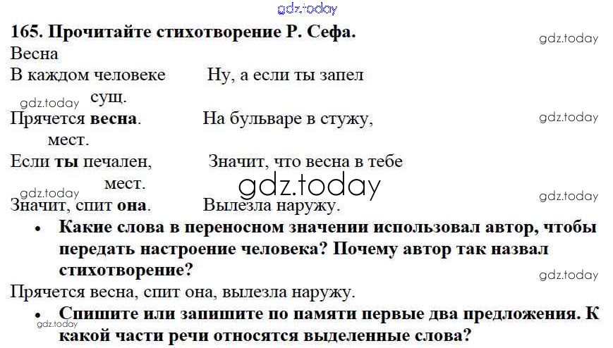 На страницах сайта gdz.today вы найдете учебный и вспомогательный материал, направленный на улучшения знаний школьной программы. ГДЗ - онлайн мир знаний Упражнения Часть 2 165 Учебнику по Русскому языку для 3 класса Канакина, Горецкий Просвещение Школа России 2013