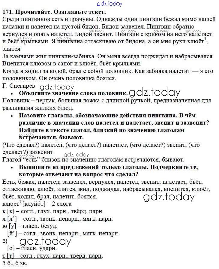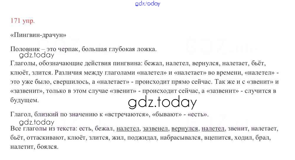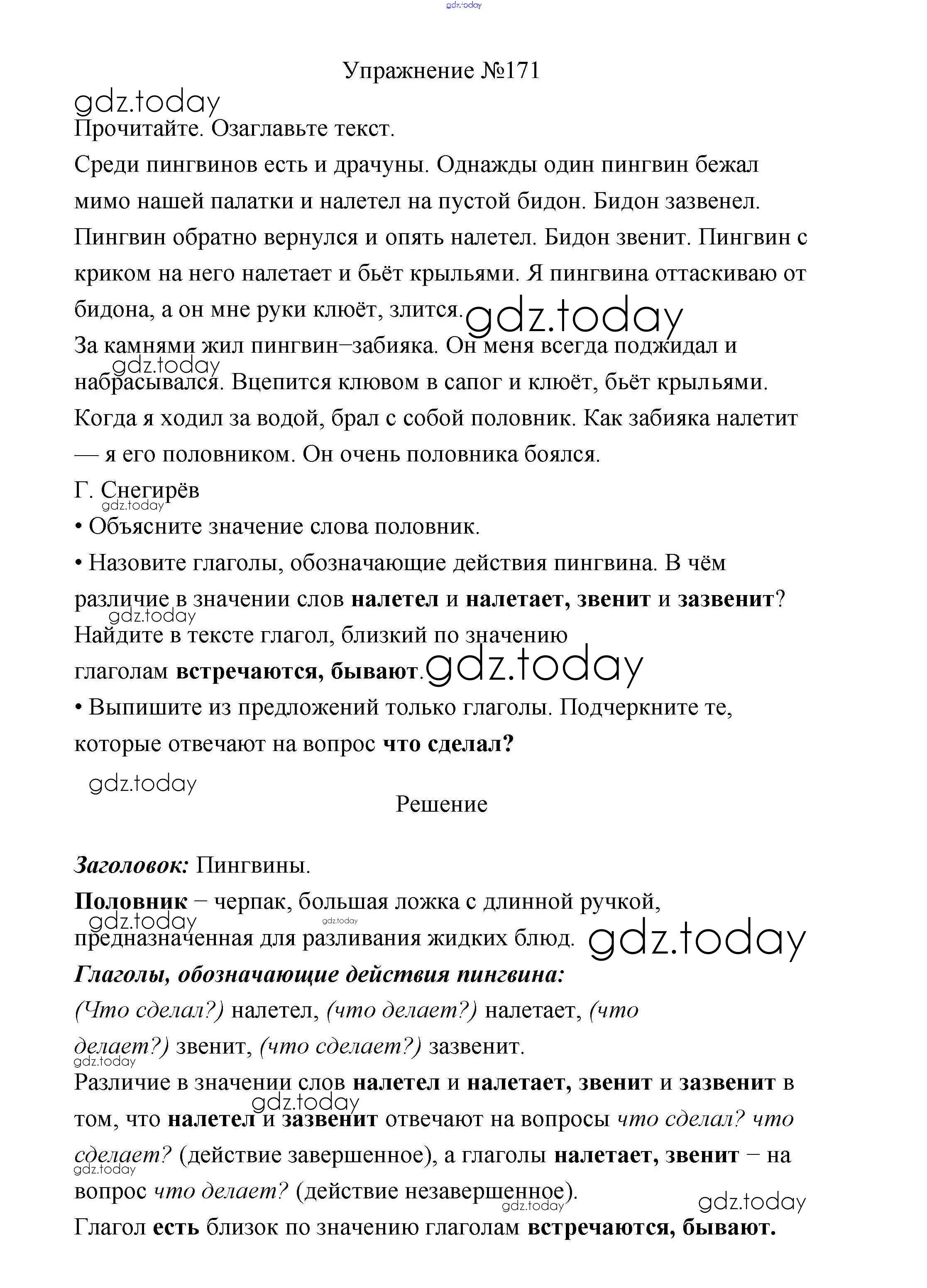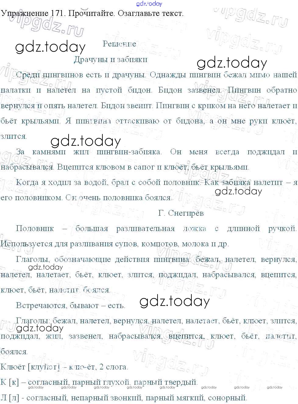 На страницах сайта gdz.today вы найдете учебный и вспомогательный материал, направленный на улучшения знаний школьной программы. ГДЗ - онлайн мир знаний Упражнения Часть 2 171 Учебнику по Русскому языку для 3 класса Канакина, Горецкий Просвещение Школа России 2013