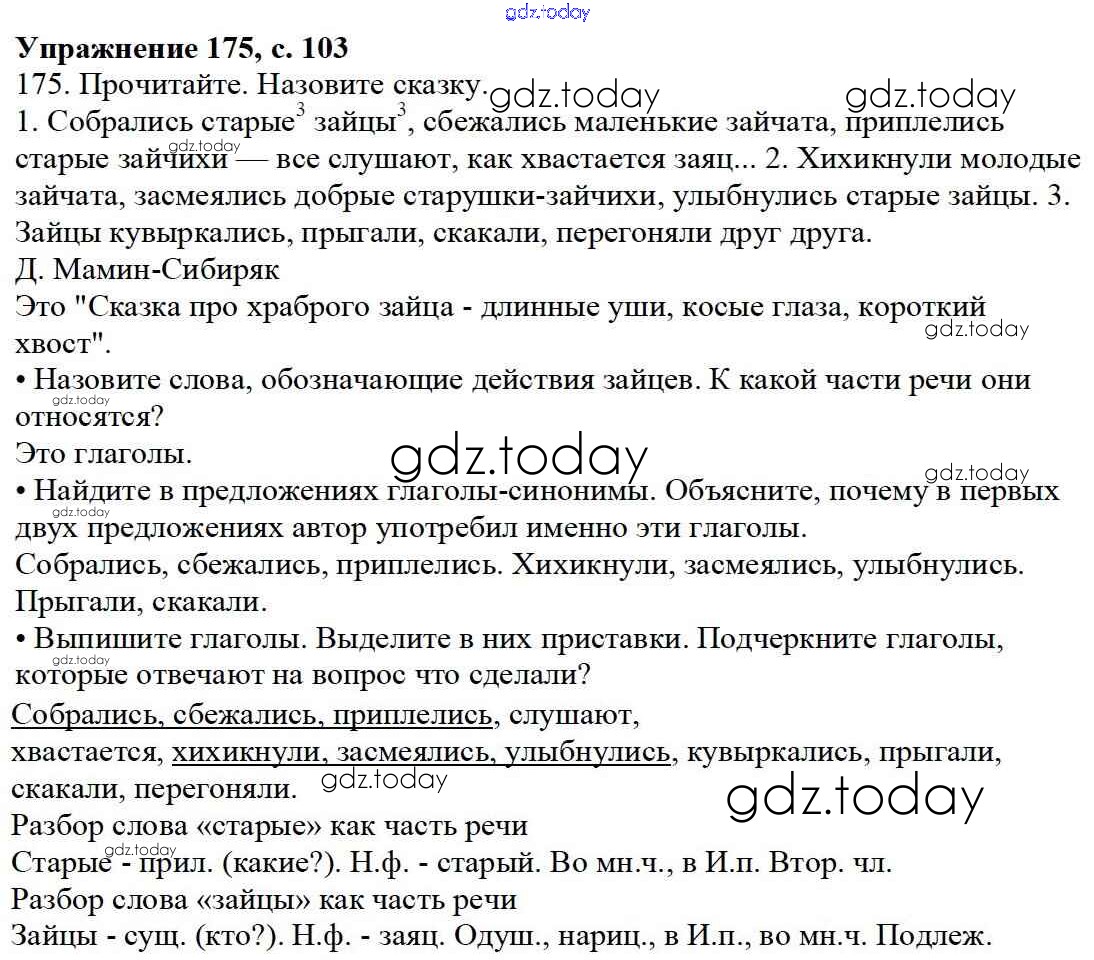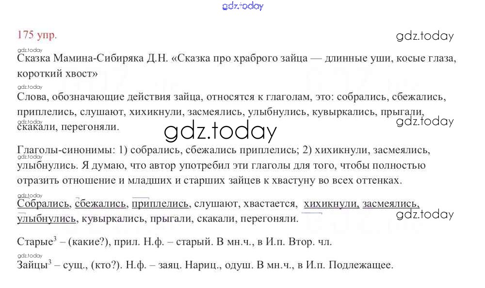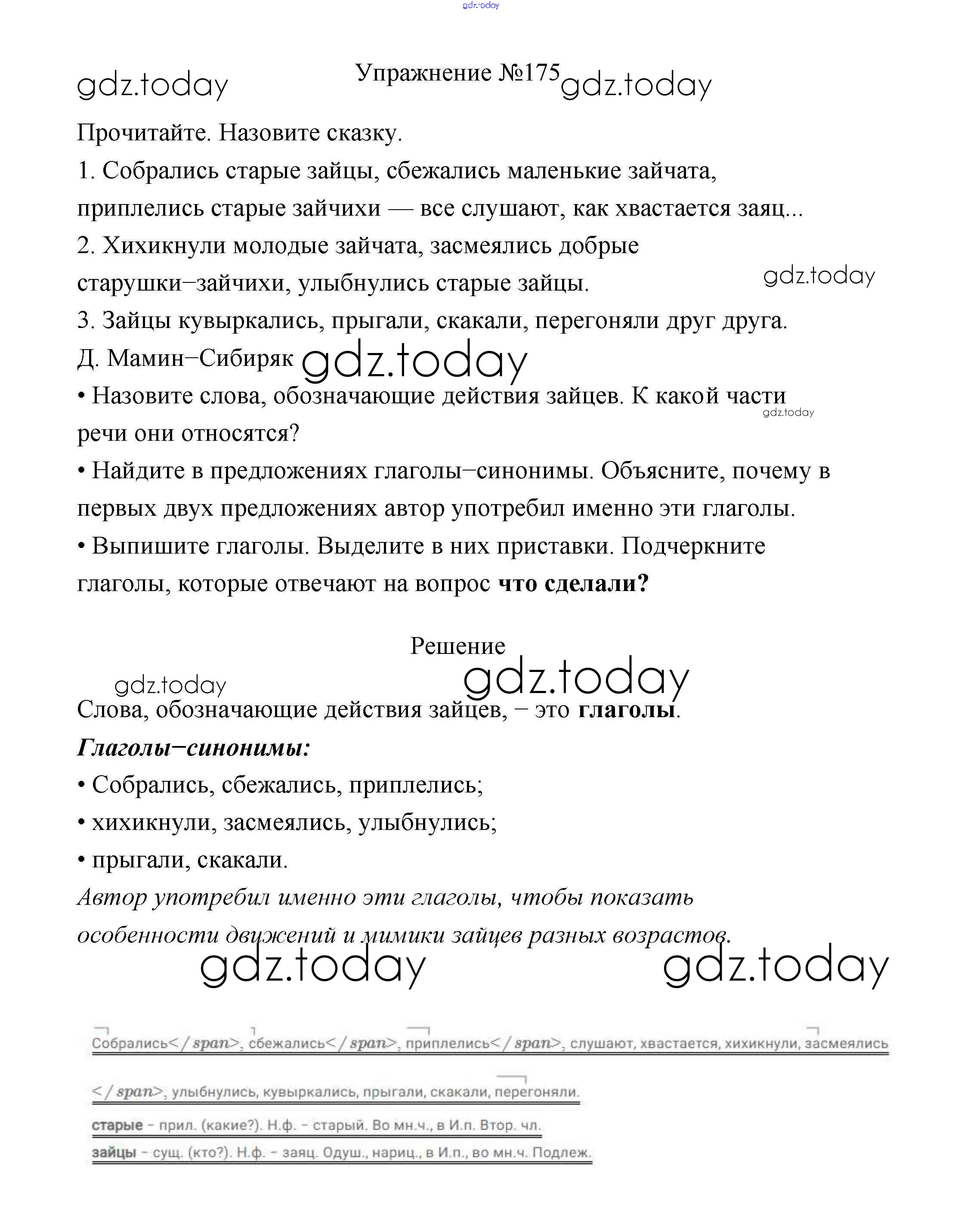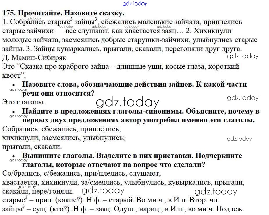 На страницах сайта gdz.today вы найдете учебный и вспомогательный материал, направленный на улучшения знаний школьной программы. ГДЗ - онлайн мир знаний Упражнения Часть 2 175 Учебнику по Русскому языку для 3 класса Канакина, Горецкий Просвещение Школа России 2013