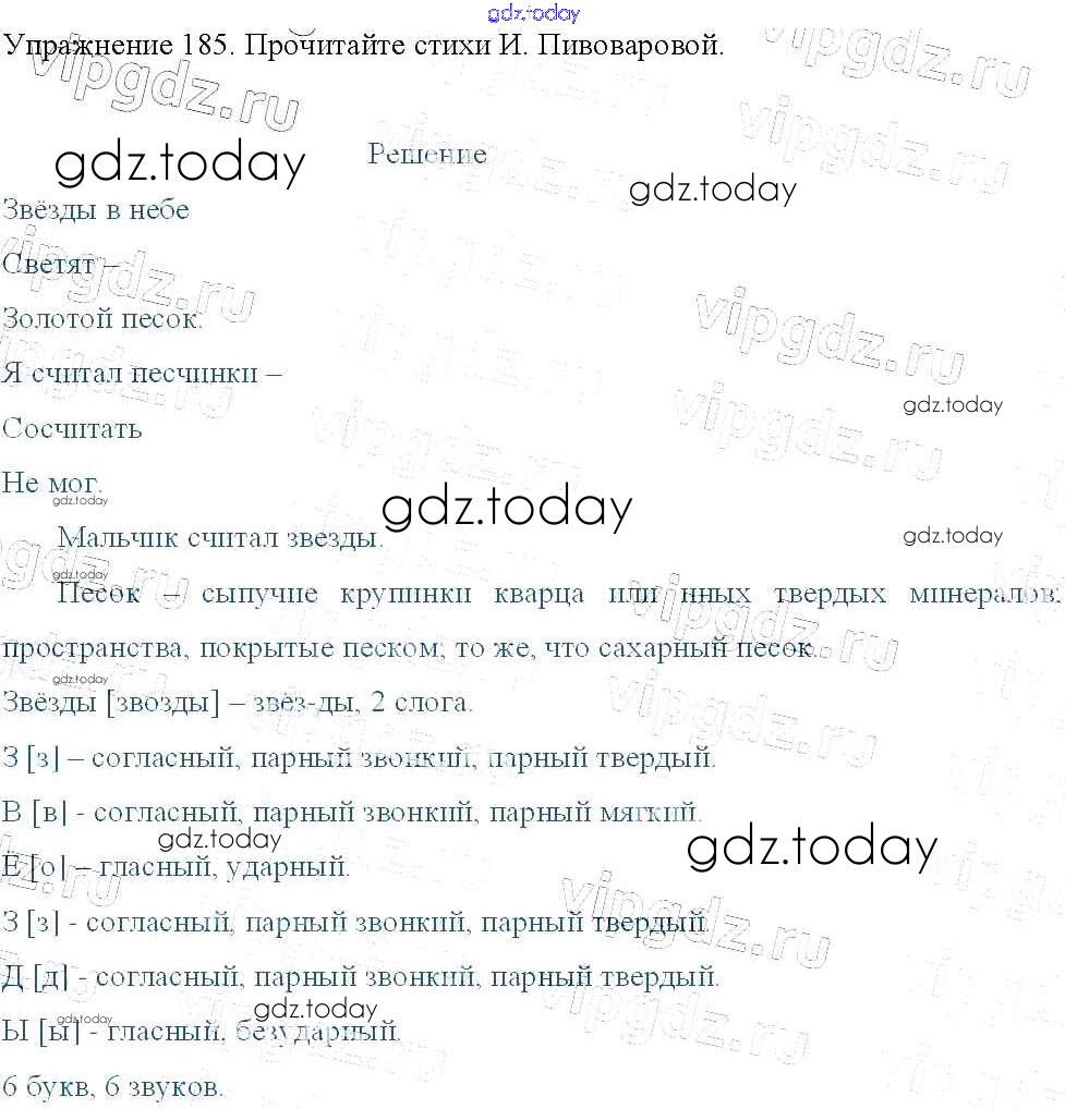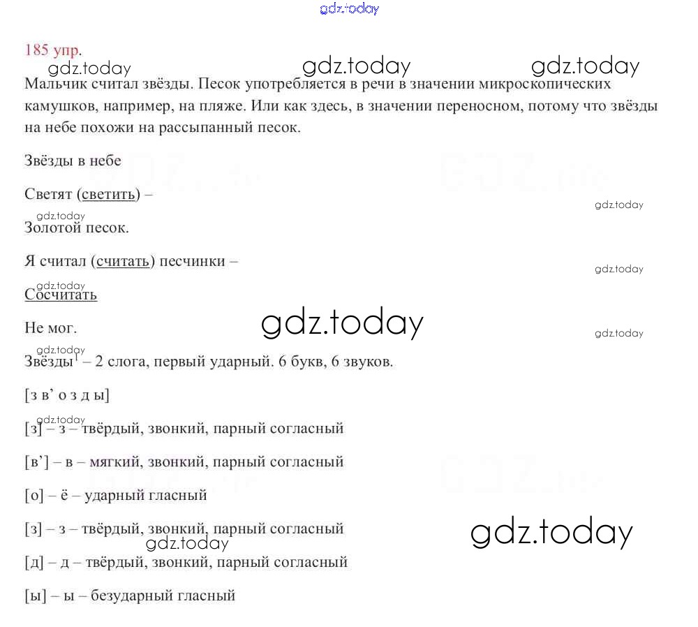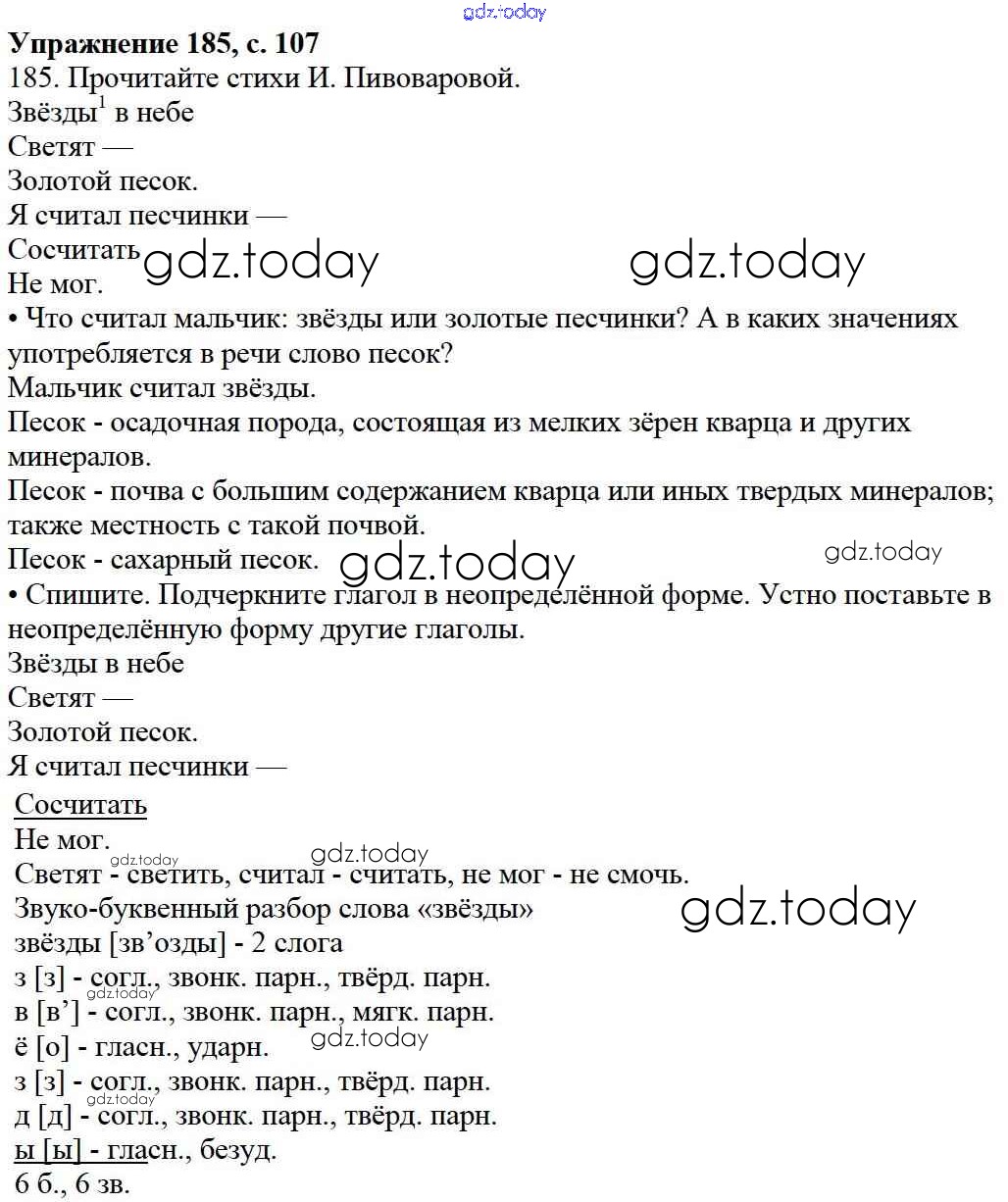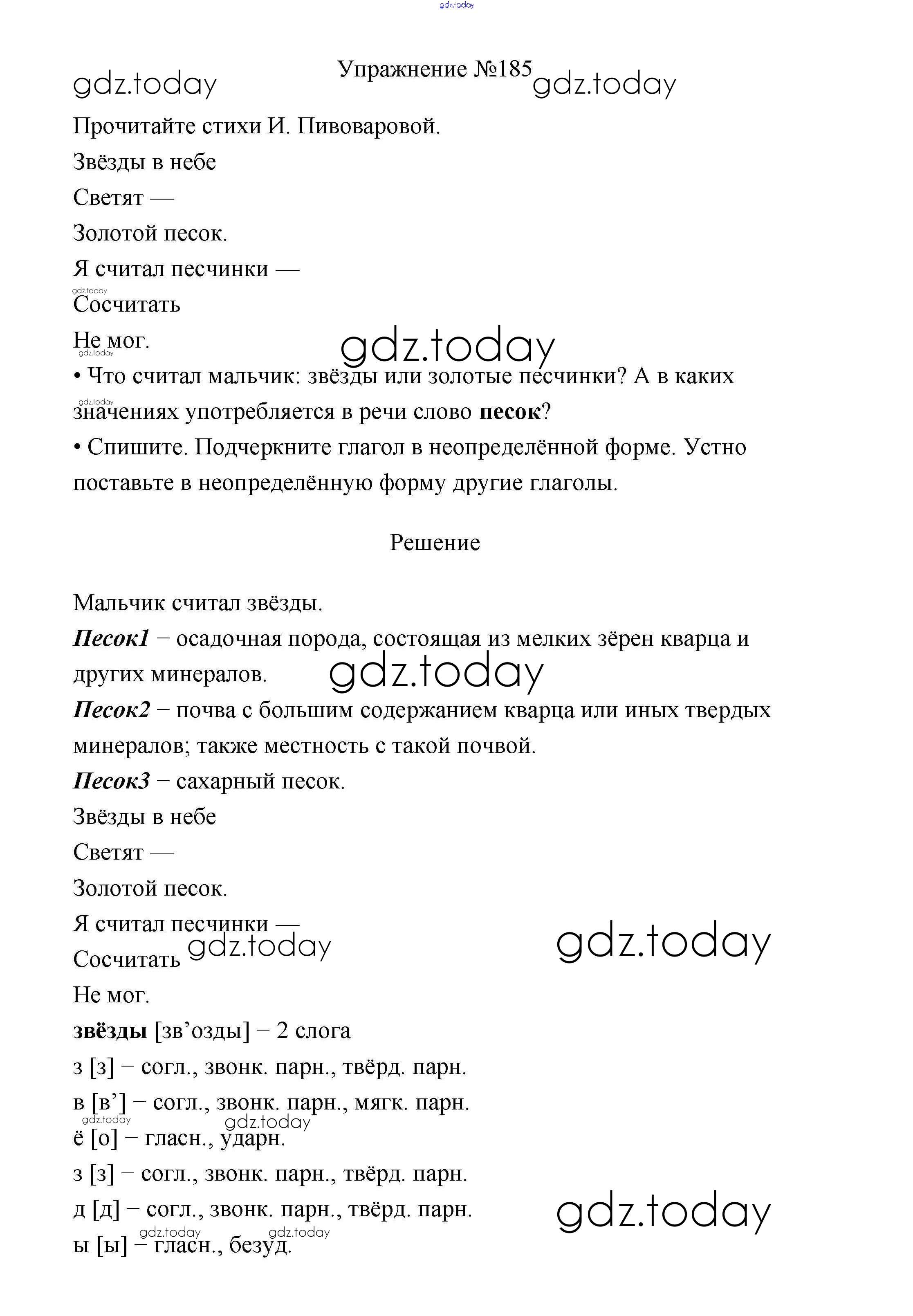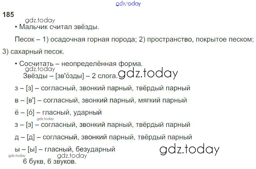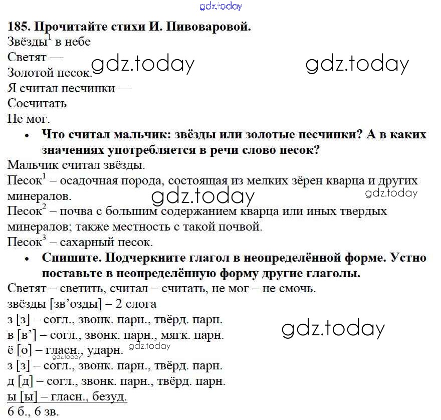 На страницах сайта gdz.today вы найдете учебный и вспомогательный материал, направленный на улучшения знаний школьной программы. ГДЗ - онлайн мир знаний Упражнения Часть 2 185 Учебнику по Русскому языку для 3 класса Канакина, Горецкий Просвещение Школа России 2013