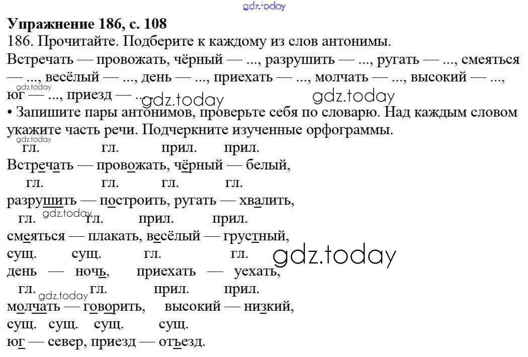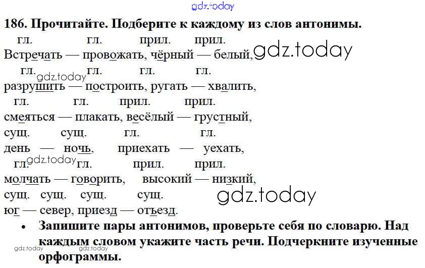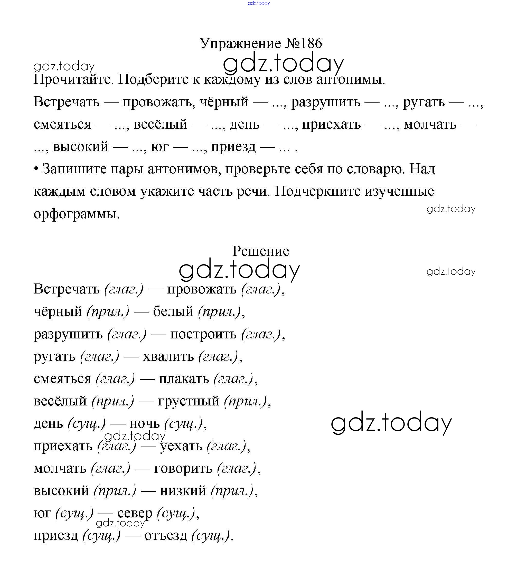 На страницах сайта gdz.today вы найдете учебный и вспомогательный материал, направленный на улучшения знаний школьной программы. ГДЗ - онлайн мир знаний Упражнения Часть 2 186 Учебнику по Русскому языку для 3 класса Канакина, Горецкий Просвещение Школа России 2013