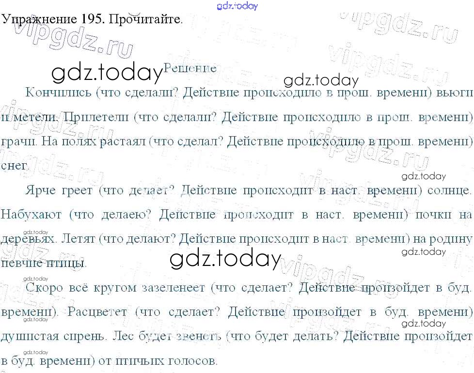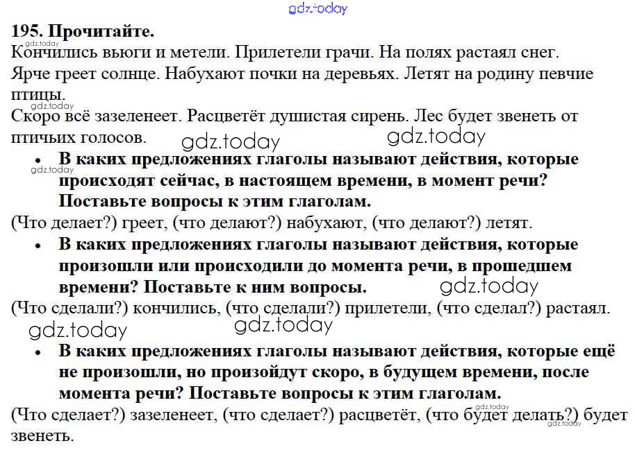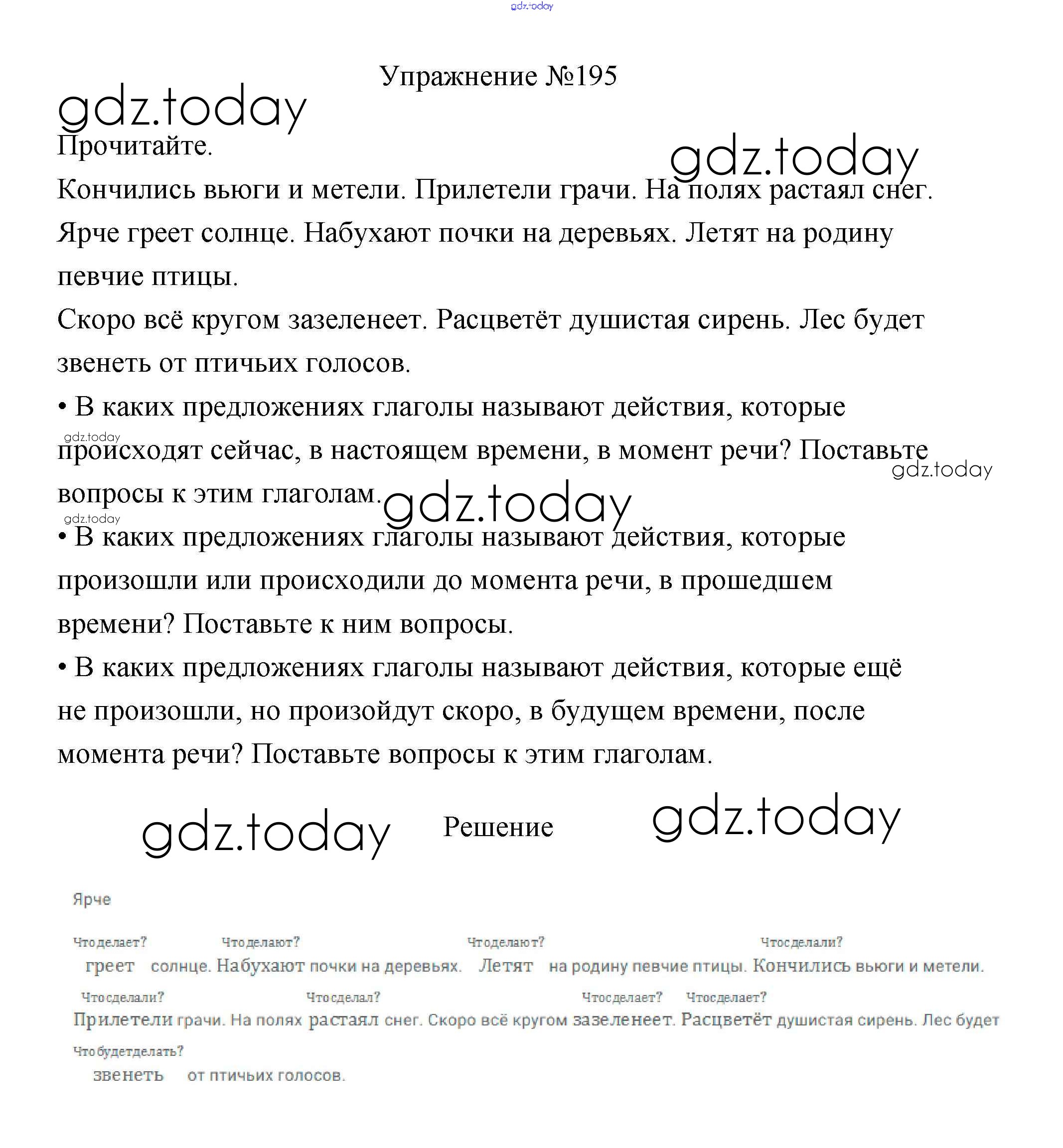 На страницах сайта gdz.today вы найдете учебный и вспомогательный материал, направленный на улучшения знаний школьной программы. ГДЗ - онлайн мир знаний Упражнения Часть 2 195 Учебнику по Русскому языку для 3 класса Канакина, Горецкий Просвещение Школа России 2013