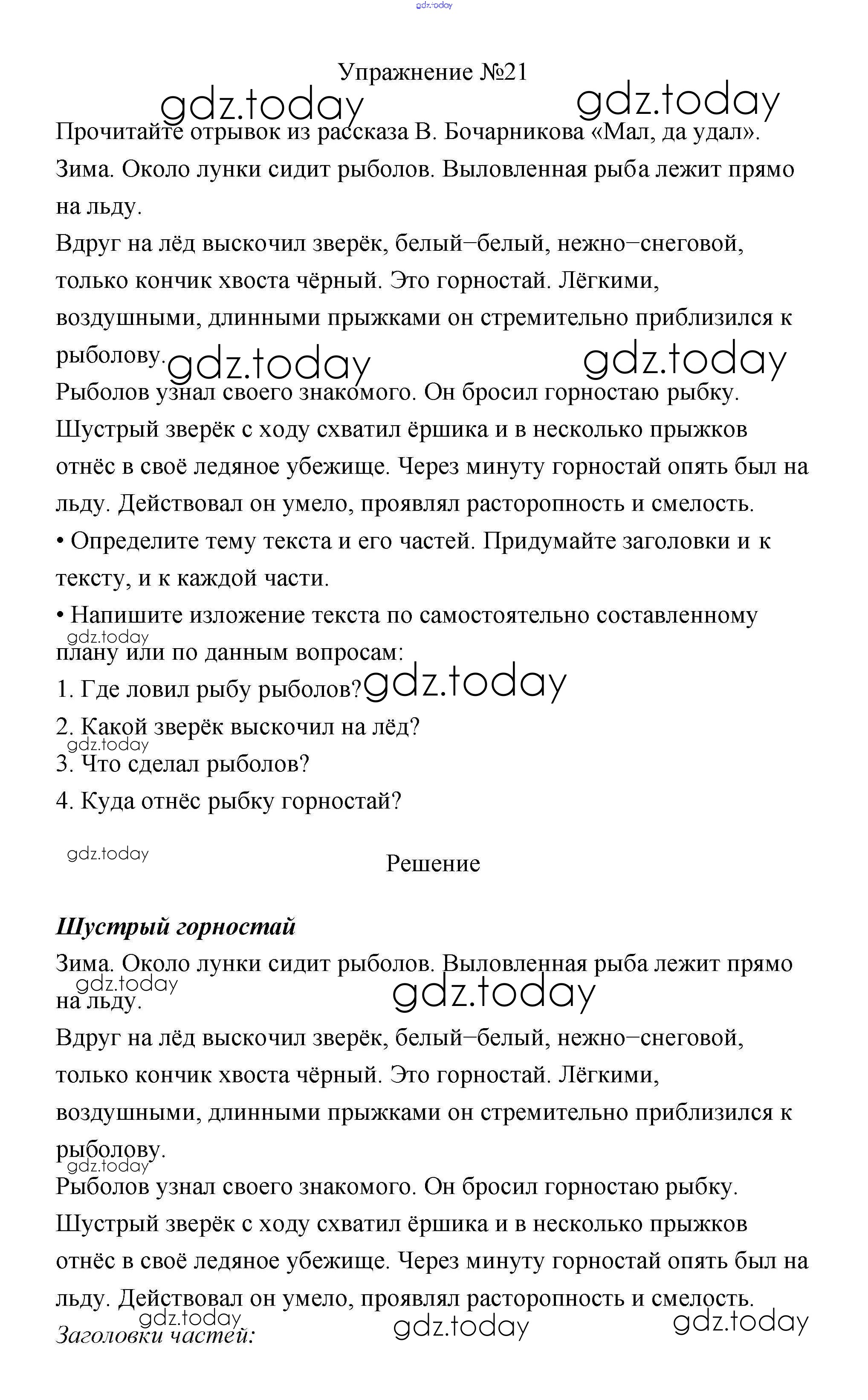 На страницах сайта gdz.today вы найдете учебный и вспомогательный материал, направленный на улучшения знаний школьной программы. ГДЗ - онлайн мир знаний Упражнения Часть 2 21 Учебнику по Русскому языку для 3 класса Канакина, Горецкий Просвещение Школа России 2013