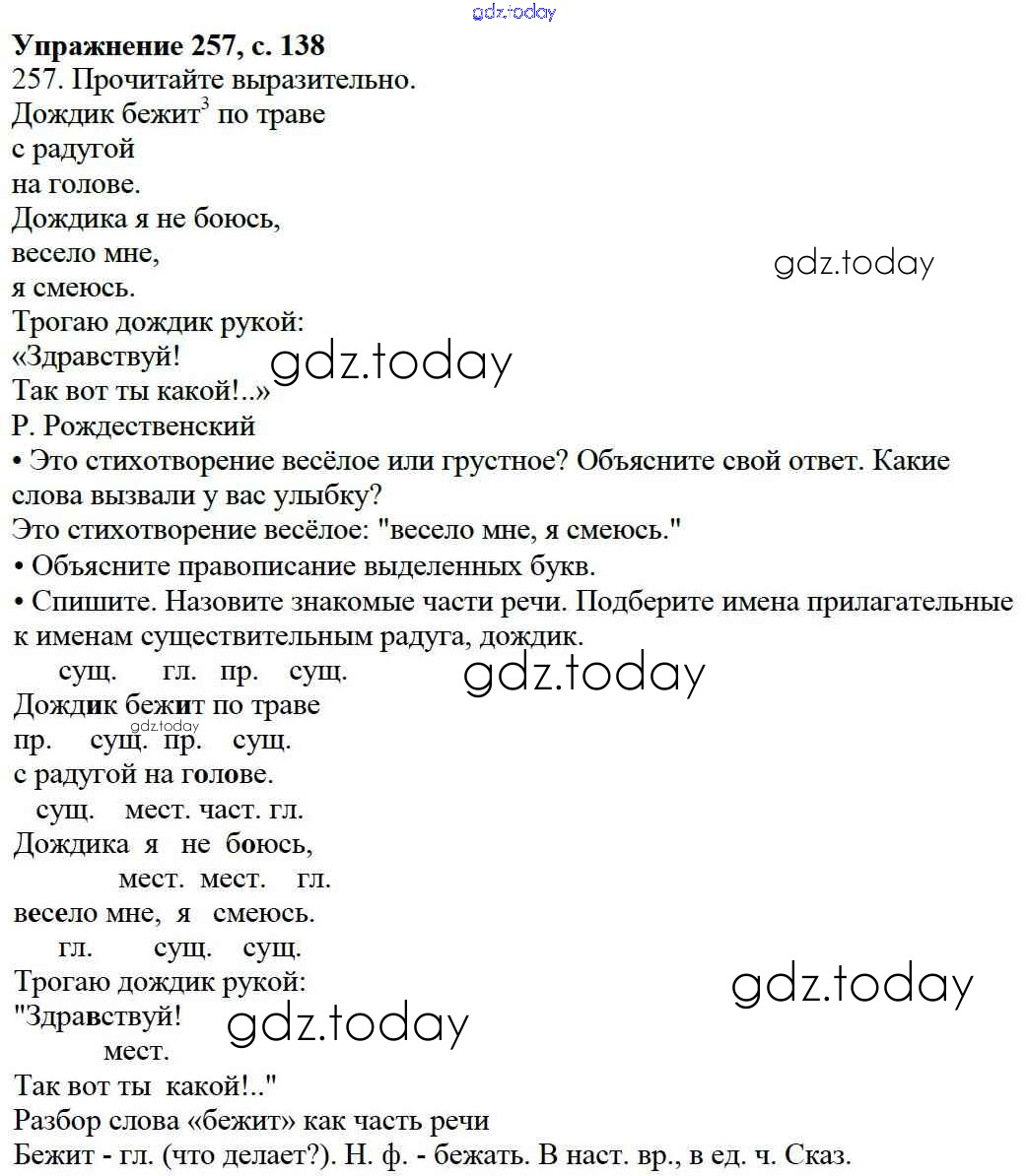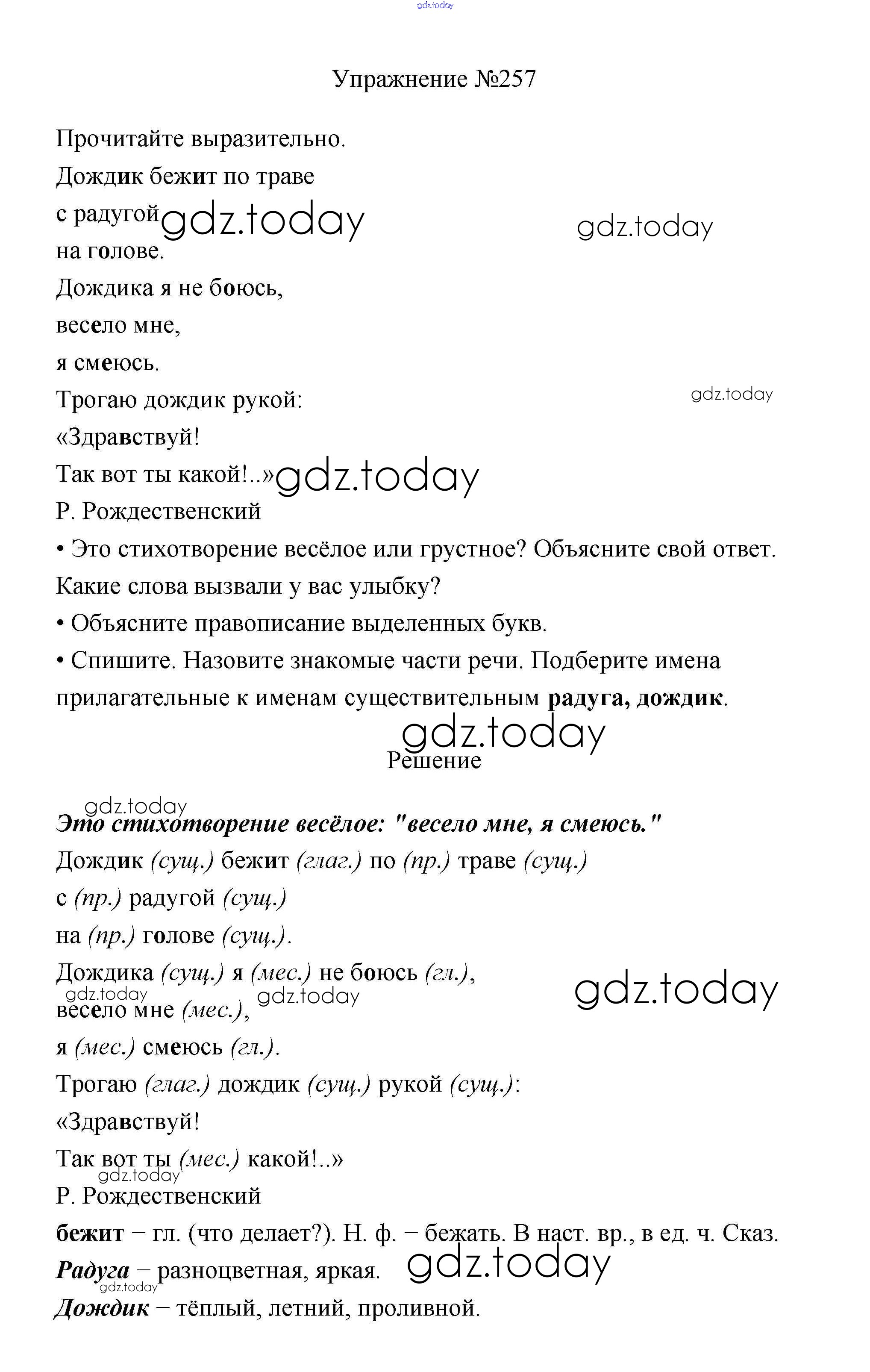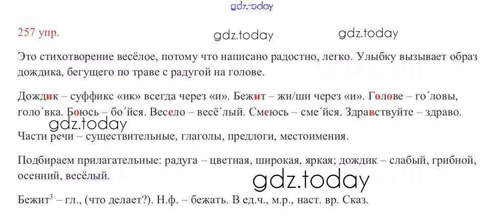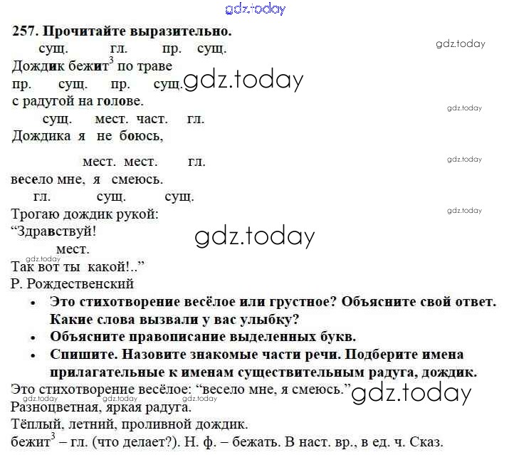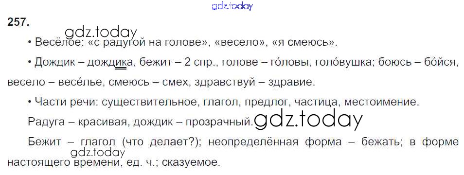 На страницах сайта gdz.today вы найдете учебный и вспомогательный материал, направленный на улучшения знаний школьной программы. ГДЗ - онлайн мир знаний Упражнения Часть 2 257 Учебнику по Русскому языку для 3 класса Канакина, Горецкий Просвещение Школа России 2013