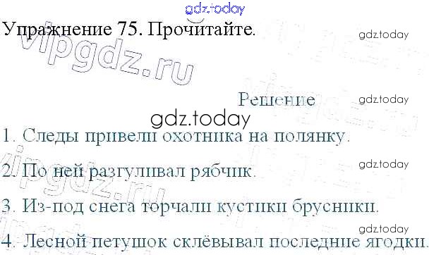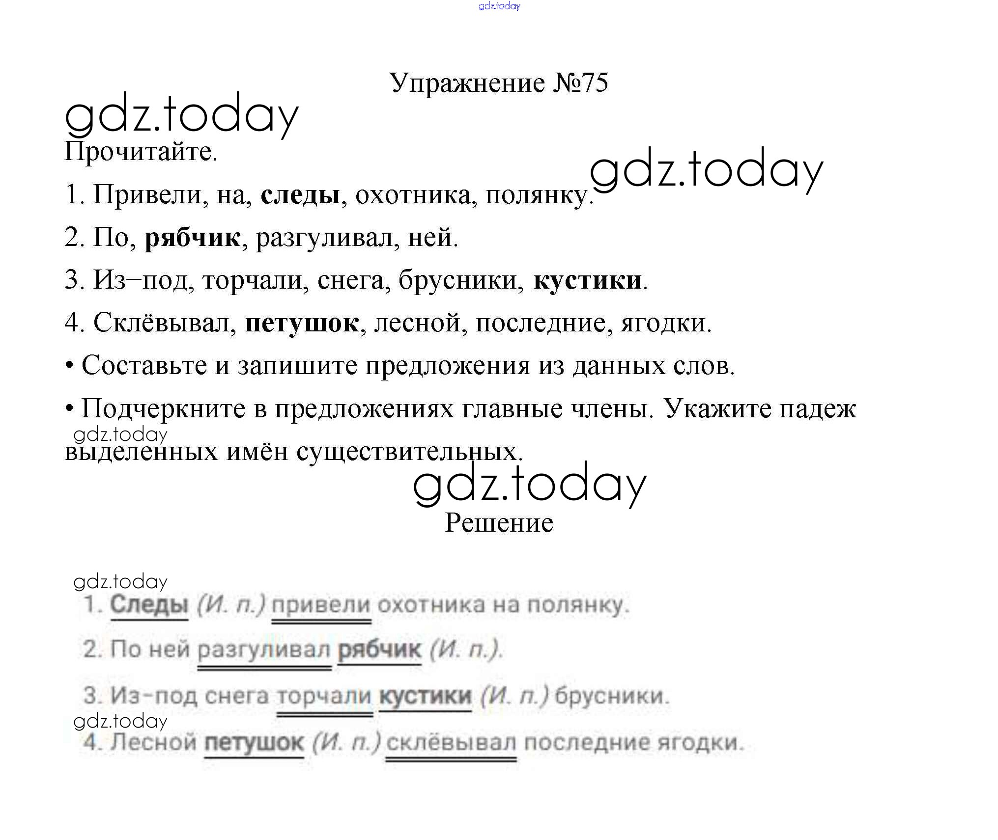 На страницах сайта gdz.today вы найдете учебный и вспомогательный материал, направленный на улучшения знаний школьной программы. ГДЗ - онлайн мир знаний Упражнения Часть 2 75 Учебнику по Русскому языку для 3 класса Канакина, Горецкий Просвещение Школа России 2013