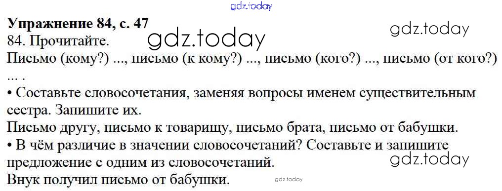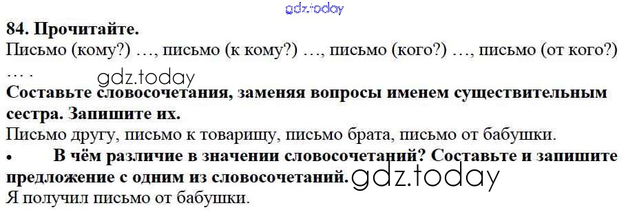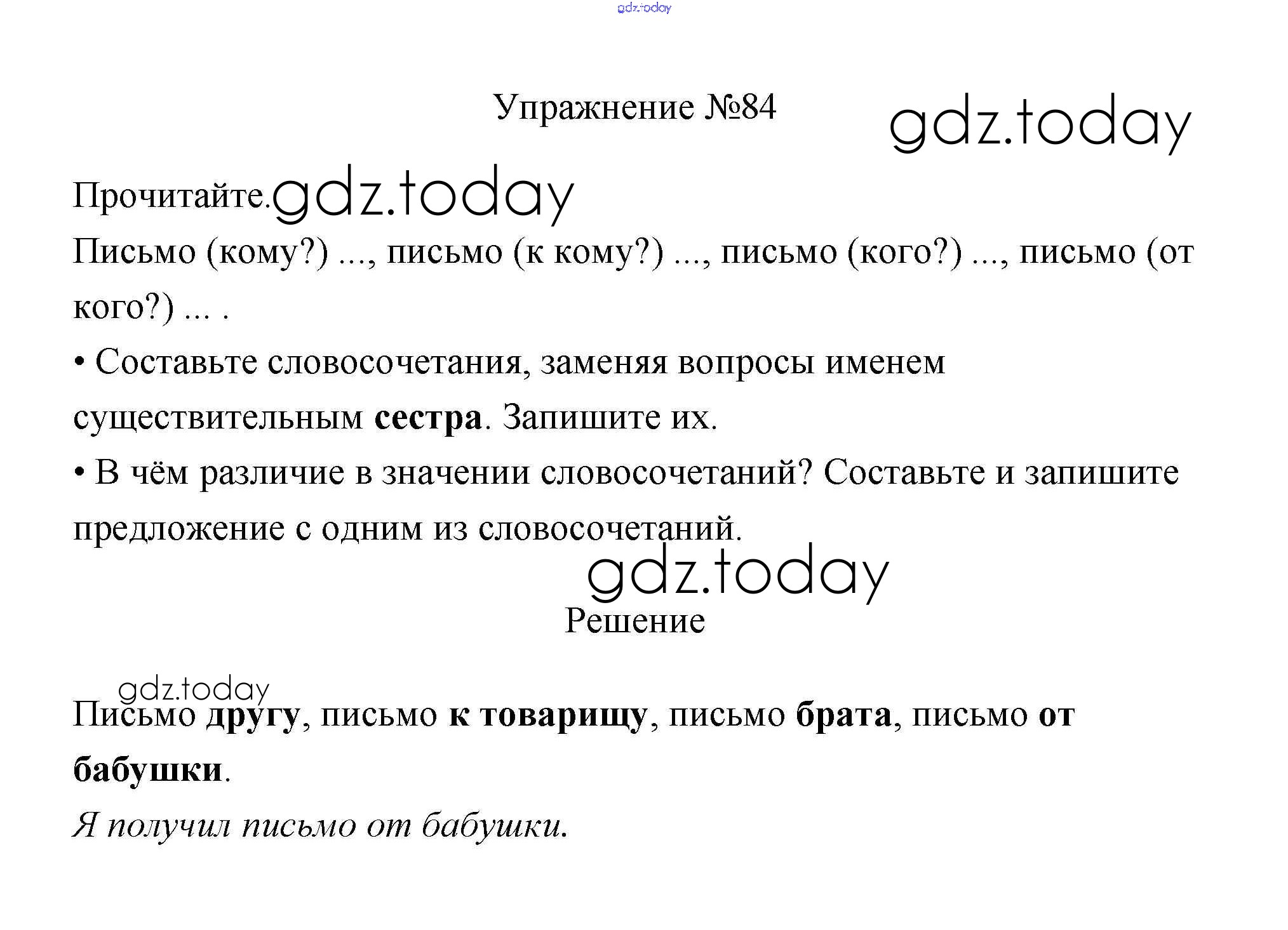 На страницах сайта gdz.today вы найдете учебный и вспомогательный материал, направленный на улучшения знаний школьной программы. ГДЗ - онлайн мир знаний Упражнения Часть 2 84 Учебнику по Русскому языку для 3 класса Канакина, Горецкий Просвещение Школа России 2013