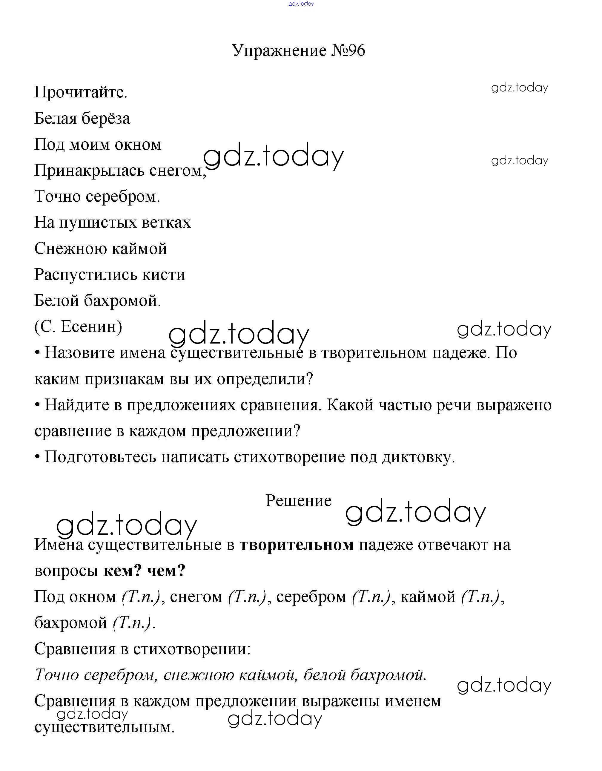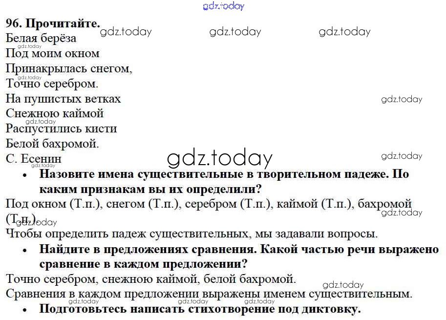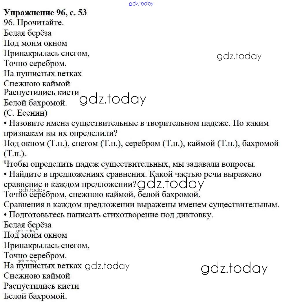 На страницах сайта gdz.today вы найдете учебный и вспомогательный материал, направленный на улучшения знаний школьной программы. ГДЗ - онлайн мир знаний Упражнения Часть 2 96 Учебнику по Русскому языку для 3 класса Канакина, Горецкий Просвещение Школа России 2013