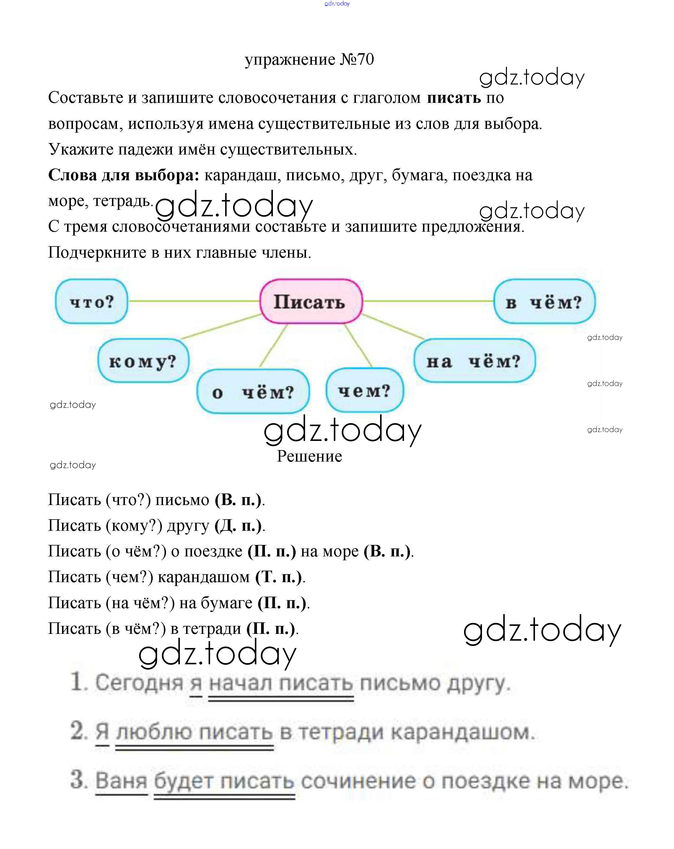 На страницах сайта gdz.today вы найдете учебный и вспомогательный материал, направленный на улучшения знаний школьной программы. ГДЗ - онлайн мир знаний Упражнения Решение. Часть 2 70 Учебнику по Русскому языку для 3 класса Климанова, Бабушкина Просвещение Перспектива 2019