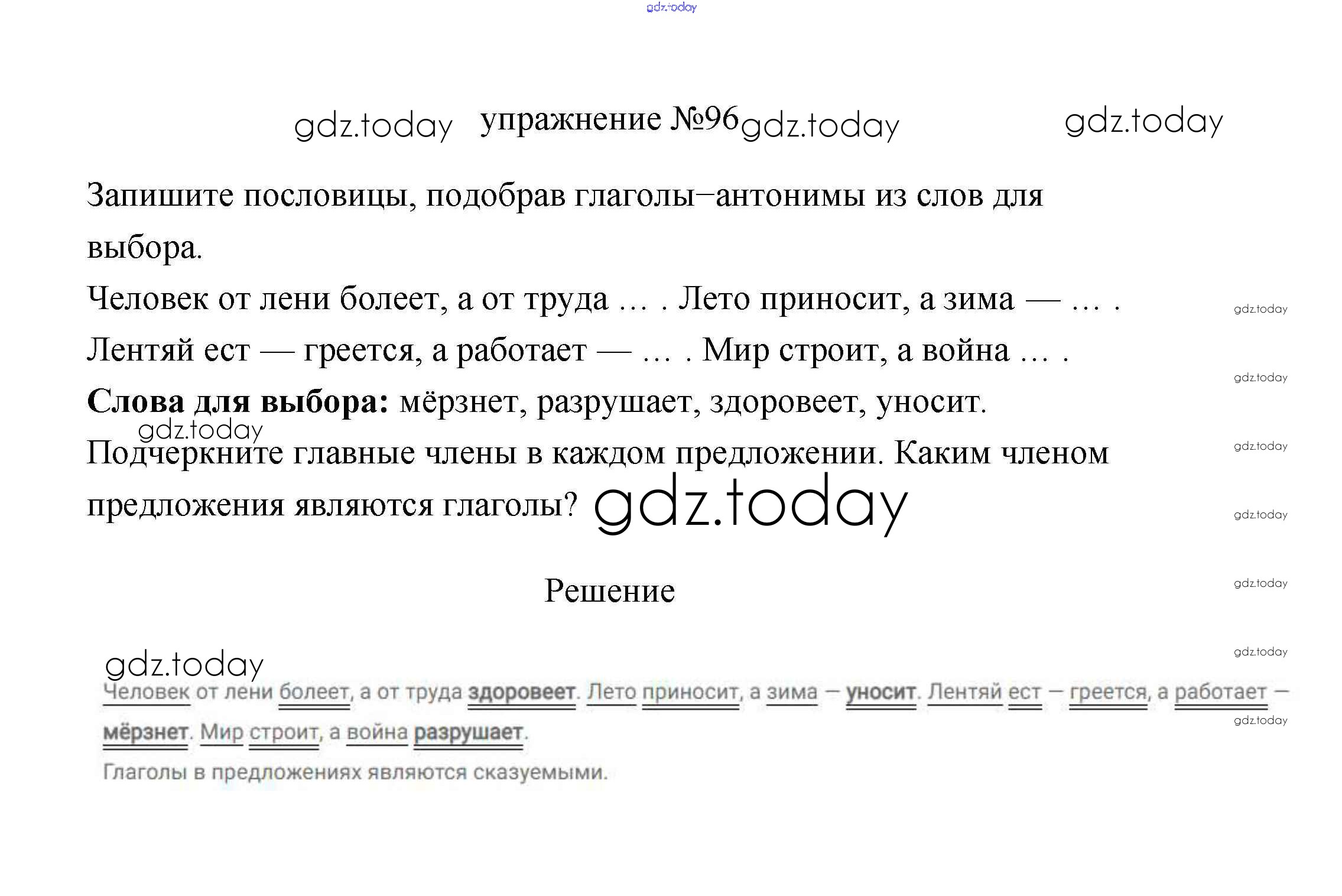 На страницах сайта gdz.today вы найдете учебный и вспомогательный материал, направленный на улучшения знаний школьной программы. ГДЗ - онлайн мир знаний Упражнения Решение. Часть 2 96 Учебнику по Русскому языку для 3 класса Климанова, Бабушкина Просвещение Перспектива 2019