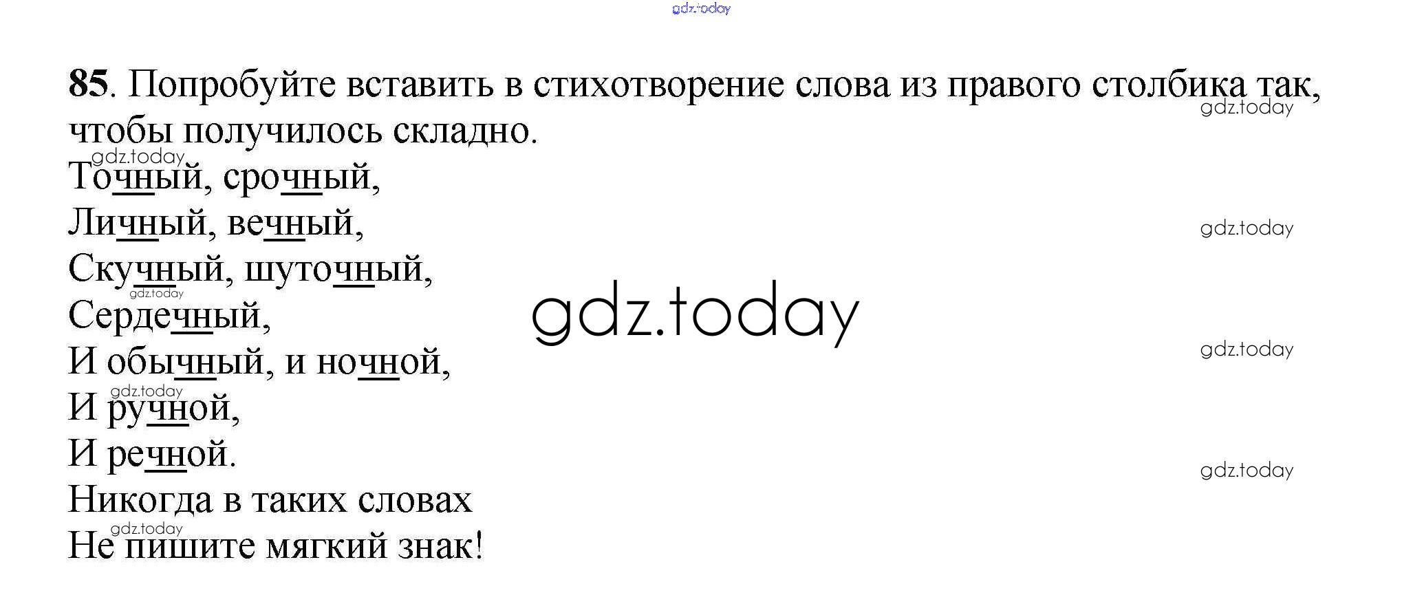 На страницах сайта gdz.today вы найдете учебный и вспомогательный материал, направленный на улучшения знаний школьной программы. ГДЗ - онлайн мир знаний Часть 1. Решение к упражнениям 85 Учебнику по Русскому языку для 3 класса Климанова, Бабушкина Просвещение Перспектива 2014