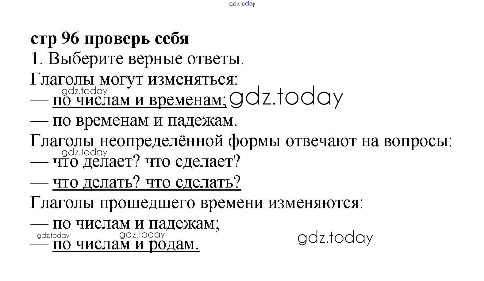 На страницах сайта gdz.today вы найдете учебный и вспомогательный материал, направленный на улучшения знаний школьной программы. ГДЗ - онлайн мир знаний Проверь себя (страницы) Часть 2. Решение к упражнениям Страница 96 Учебнику по Русскому языку для 3 класса Климанова, Бабушкина Просвещение Перспектива 2014