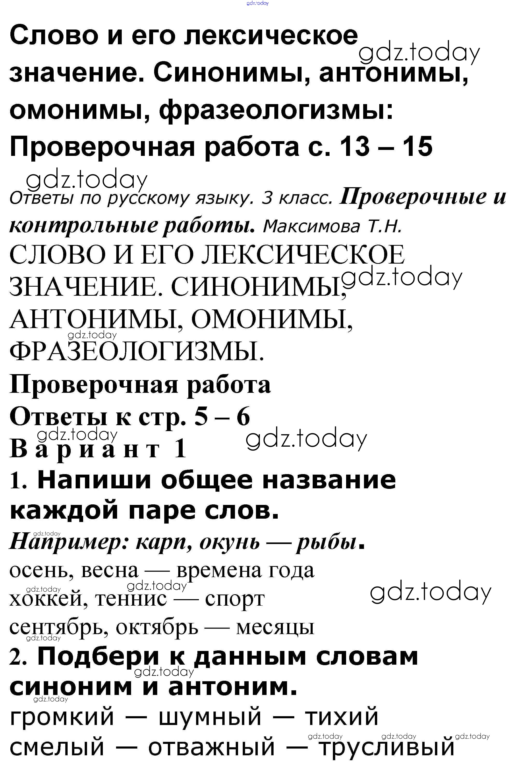 На страницах сайта gdz.today вы найдете учебный и вспомогательный материал, направленный на улучшения знаний школьной программы. ГДЗ - онлайн мир знаний Решение к теме "Слово и его лексическое значение. Синонимы, антонимы, омонимы, фразеологизмы" 13-15 Проверочным и контрольным работам по Русскому языку для 3 класса Максимова ВАКО 2018