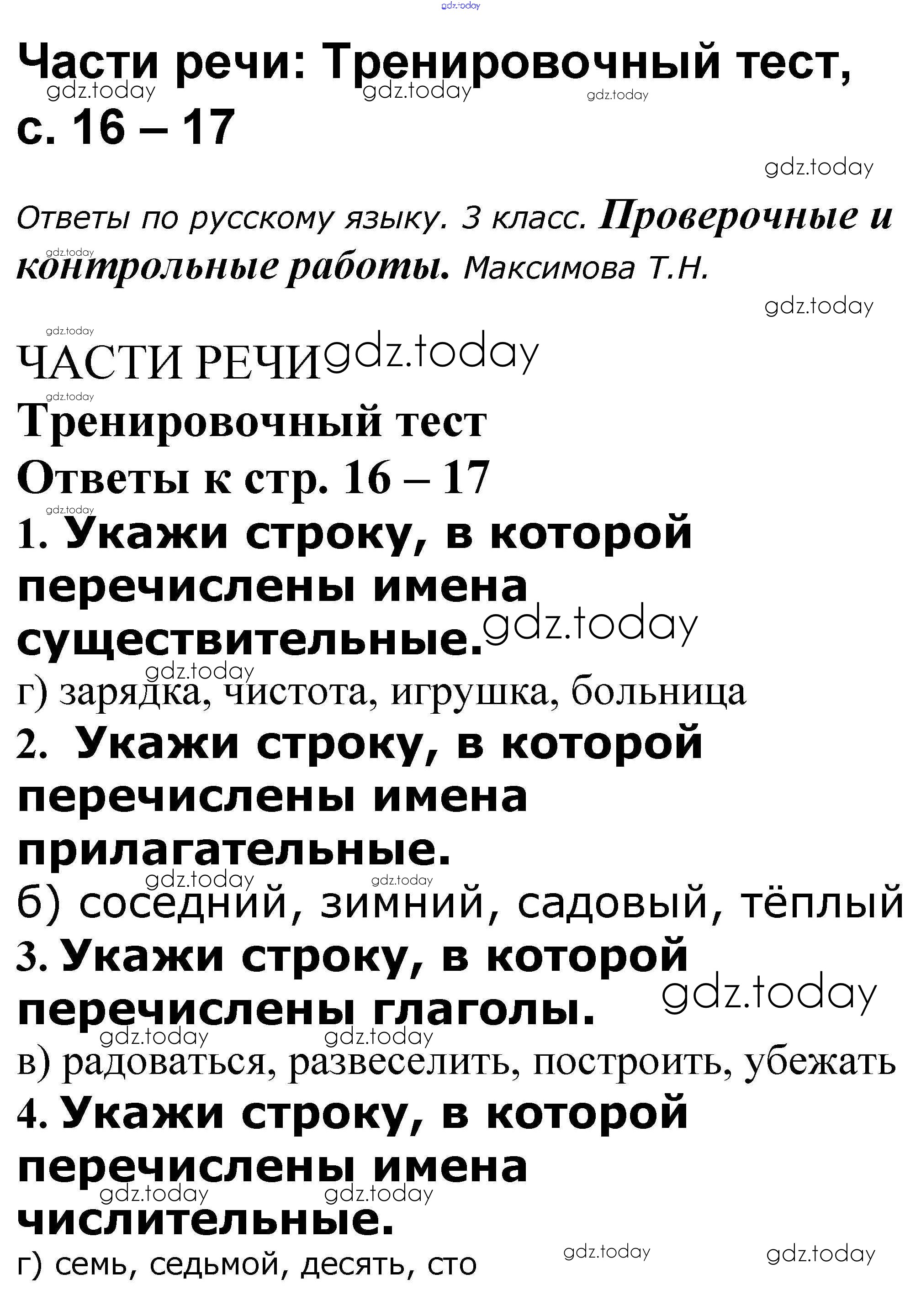 На страницах сайта gdz.today вы найдете учебный и вспомогательный материал, направленный на улучшения знаний школьной программы. ГДЗ - онлайн мир знаний Решение к теме "Части речи" 16-17 Проверочным и контрольным работам по Русскому языку для 3 класса Максимова ВАКО 2018