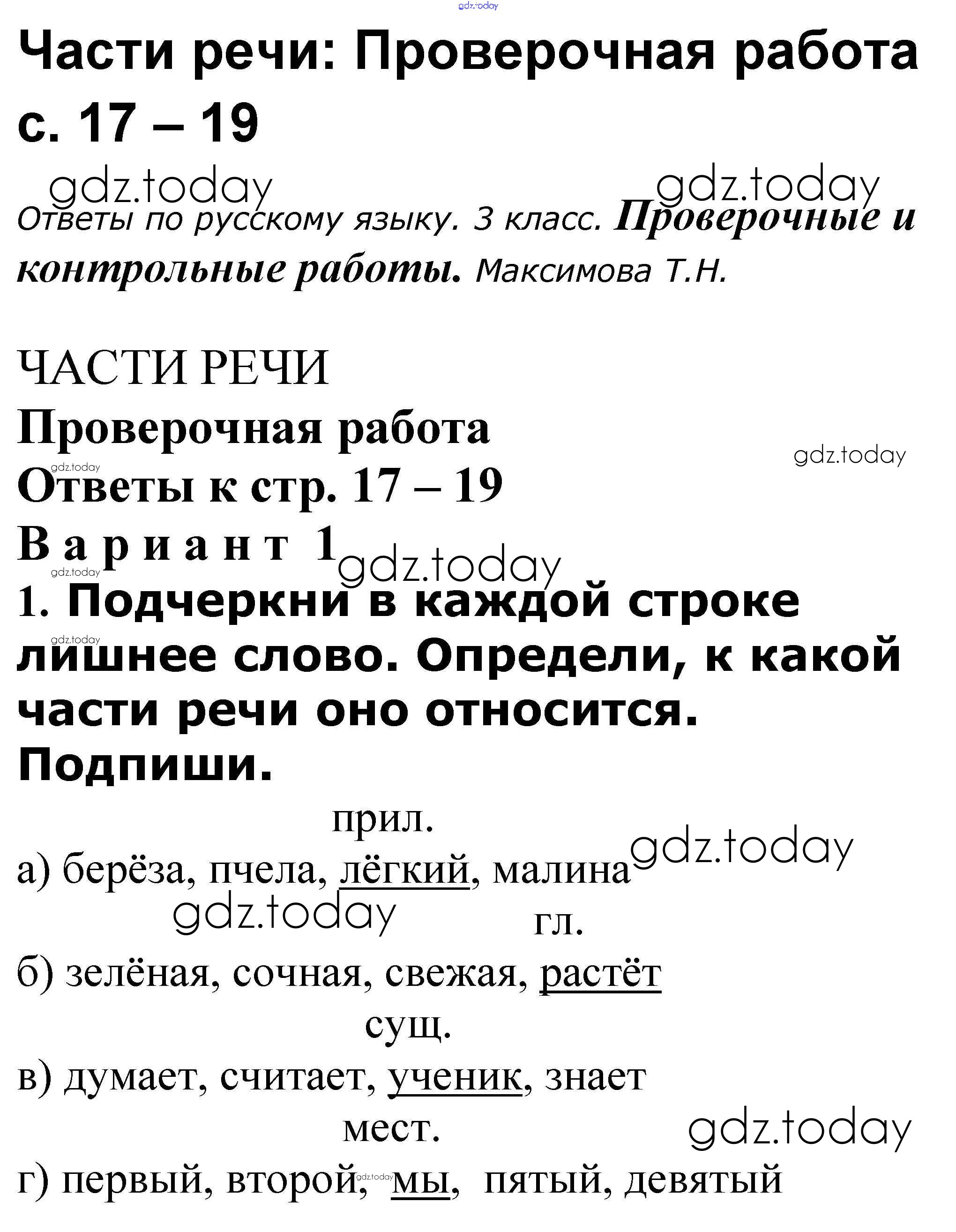 На страницах сайта gdz.today вы найдете учебный и вспомогательный материал, направленный на улучшения знаний школьной программы. ГДЗ - онлайн мир знаний Решение к теме "Части речи" 17-19 Проверочным и контрольным работам по Русскому языку для 3 класса Максимова ВАКО 2018