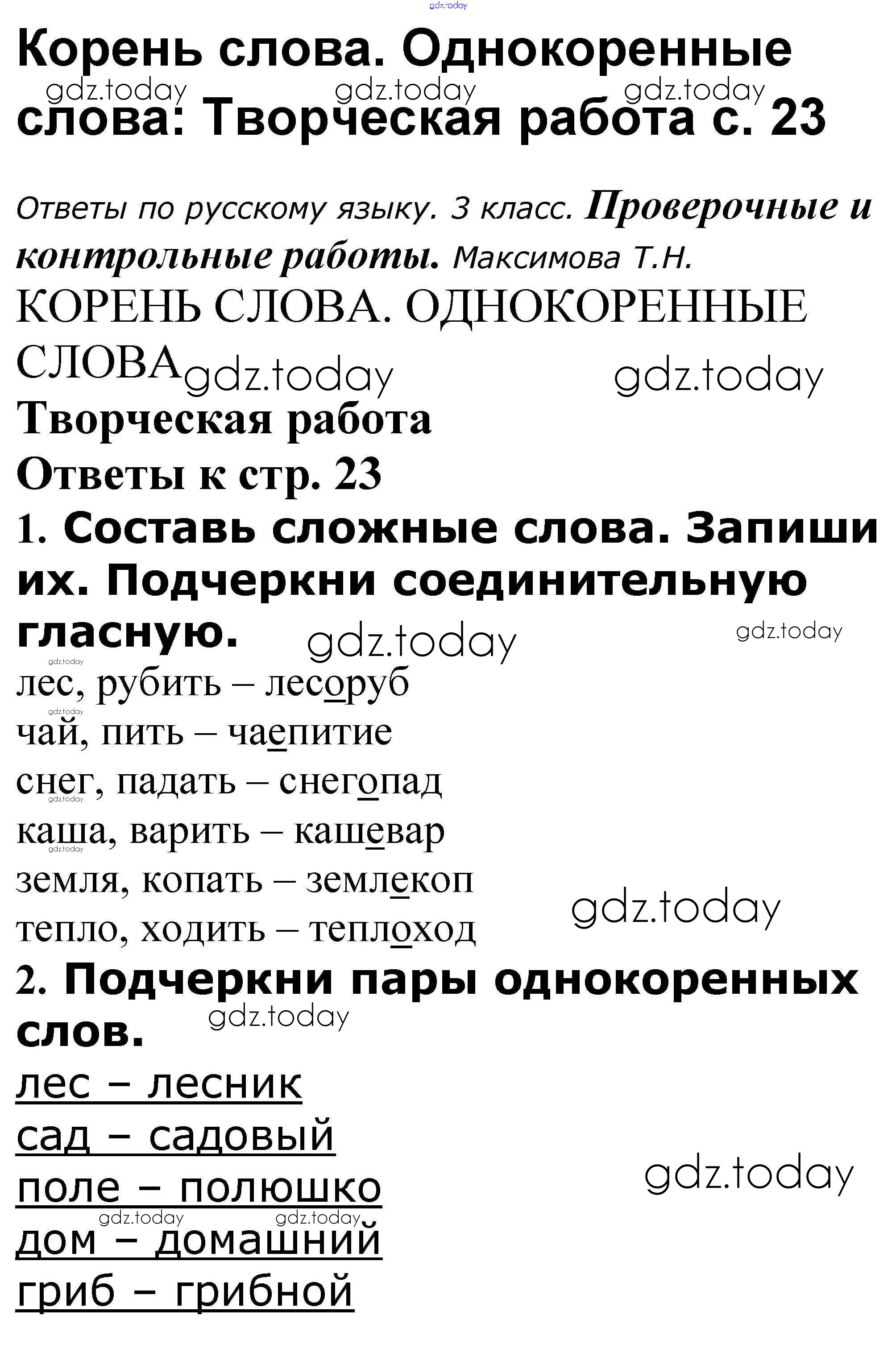 На страницах сайта gdz.today вы найдете учебный и вспомогательный материал, направленный на улучшения знаний школьной программы. ГДЗ - онлайн мир знаний Решение к теме "Корень слова. Однокоренные слова" 23 Проверочным и контрольным работам по Русскому языку для 3 класса Максимова ВАКО 2018