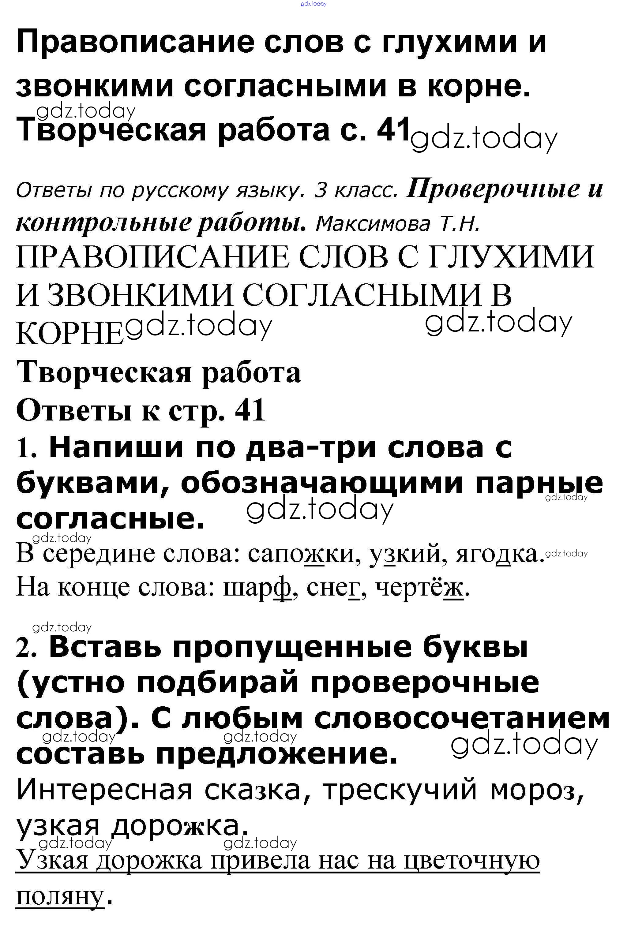 На страницах сайта gdz.today вы найдете учебный и вспомогательный материал, направленный на улучшения знаний школьной программы. ГДЗ - онлайн мир знаний Решение к теме "Правописание слов с глухими и звонкими согласными в корне" 41 Проверочным и контрольным работам по Русскому языку для 3 класса Максимова ВАКО 2018