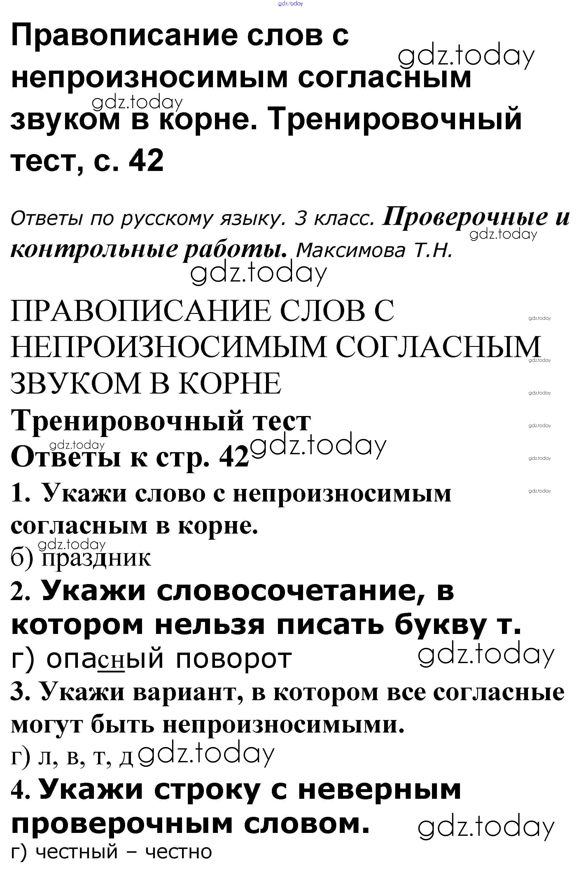 На страницах сайта gdz.today вы найдете учебный и вспомогательный материал, направленный на улучшения знаний школьной программы. ГДЗ - онлайн мир знаний Решение к теме "Правописание слов с непроизносимым согласным звуком в корне" 42 Проверочным и контрольным работам по Русскому языку для 3 класса Максимова ВАКО 2018