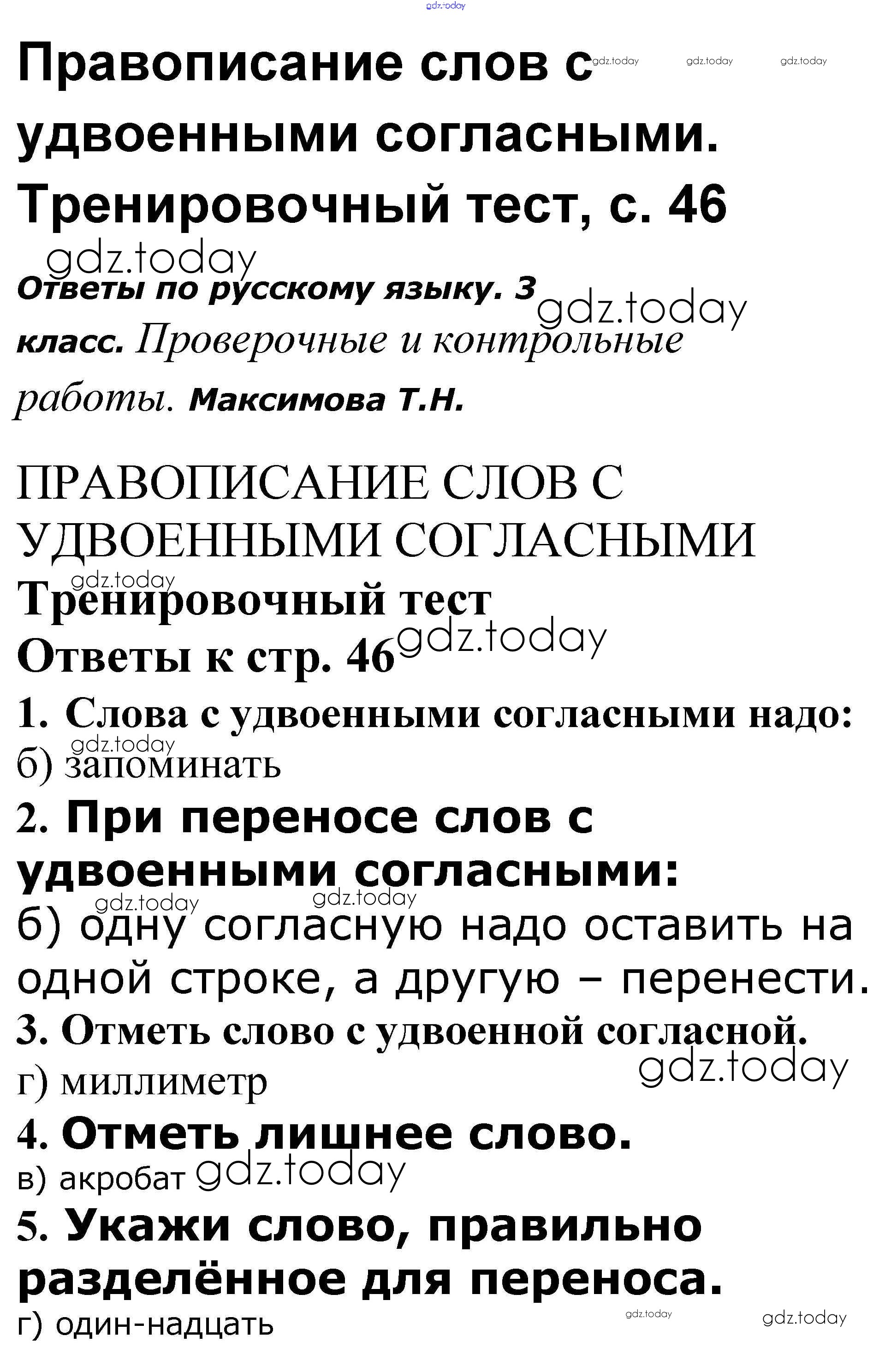 На страницах сайта gdz.today вы найдете учебный и вспомогательный материал, направленный на улучшения знаний школьной программы. ГДЗ - онлайн мир знаний Решение к теме "Правописание слов с удвоенными согласными" 46 Проверочным и контрольным работам по Русскому языку для 3 класса Максимова ВАКО 2018