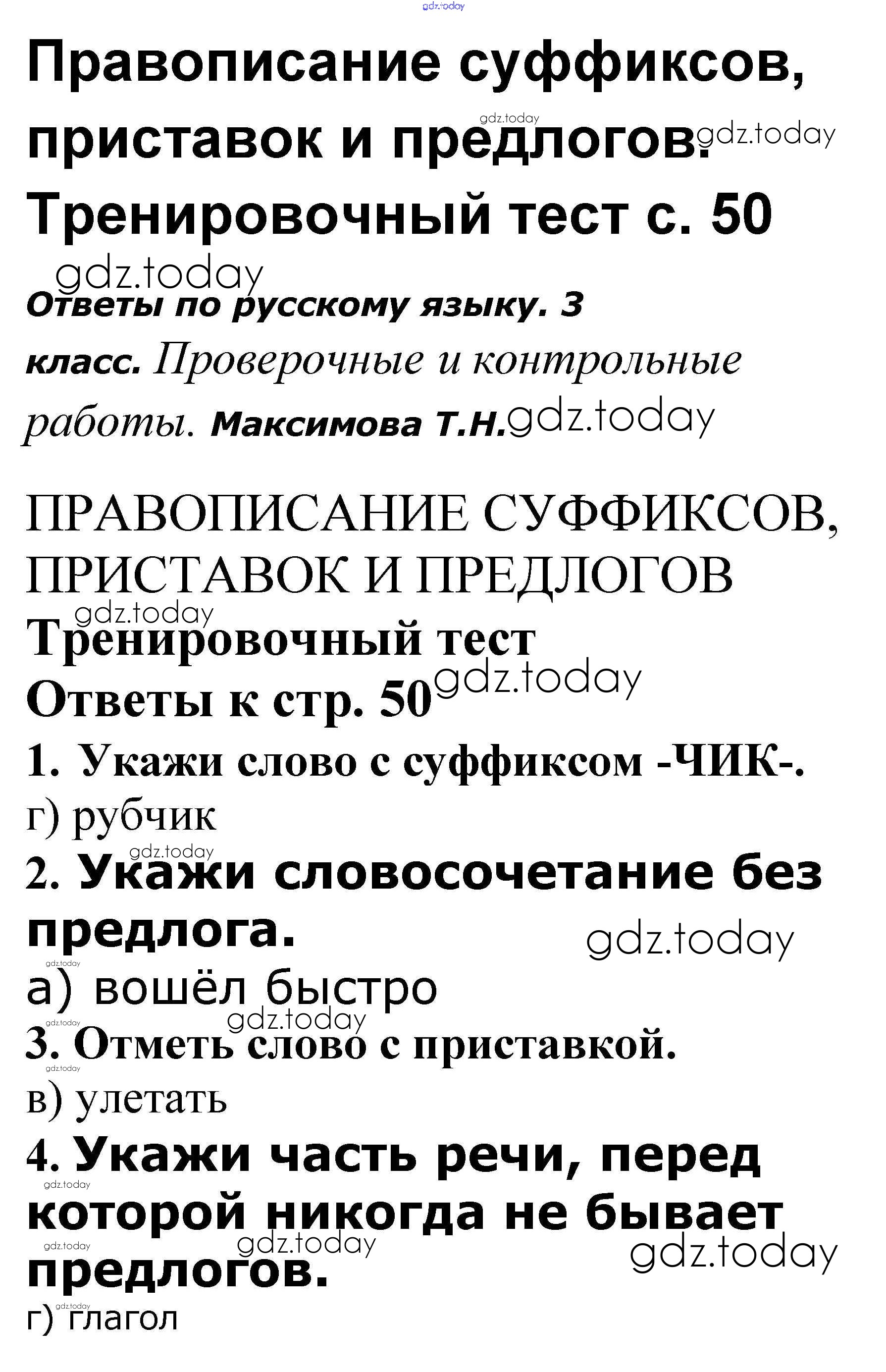 На страницах сайта gdz.today вы найдете учебный и вспомогательный материал, направленный на улучшения знаний школьной программы. ГДЗ - онлайн мир знаний Решение к теме "Правописание суффиксов, приставок и предлогов" 50 Проверочным и контрольным работам по Русскому языку для 3 класса Максимова ВАКО 2018