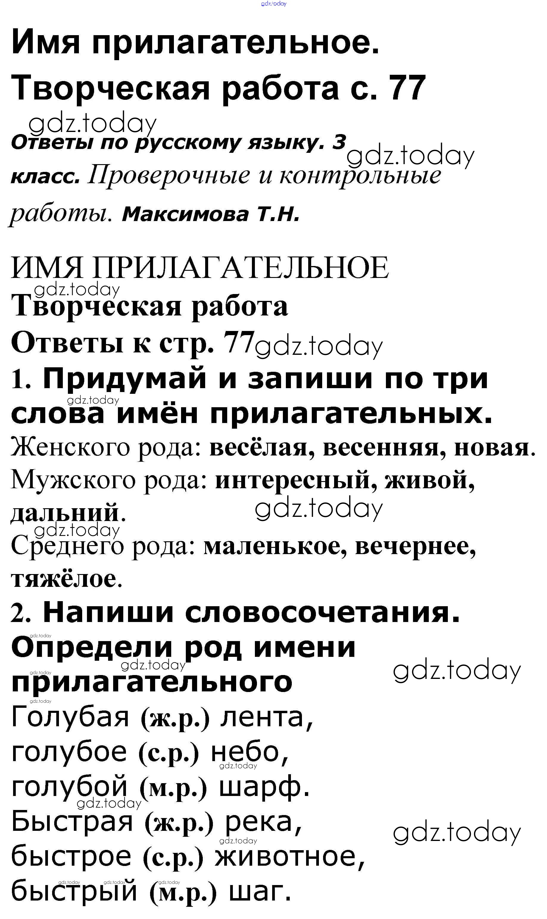 На страницах сайта gdz.today вы найдете учебный и вспомогательный материал, направленный на улучшения знаний школьной программы. ГДЗ - онлайн мир знаний Решение к теме "Имя прилагательное" 77 Проверочным и контрольным работам по Русскому языку для 3 класса Максимова ВАКО 2018