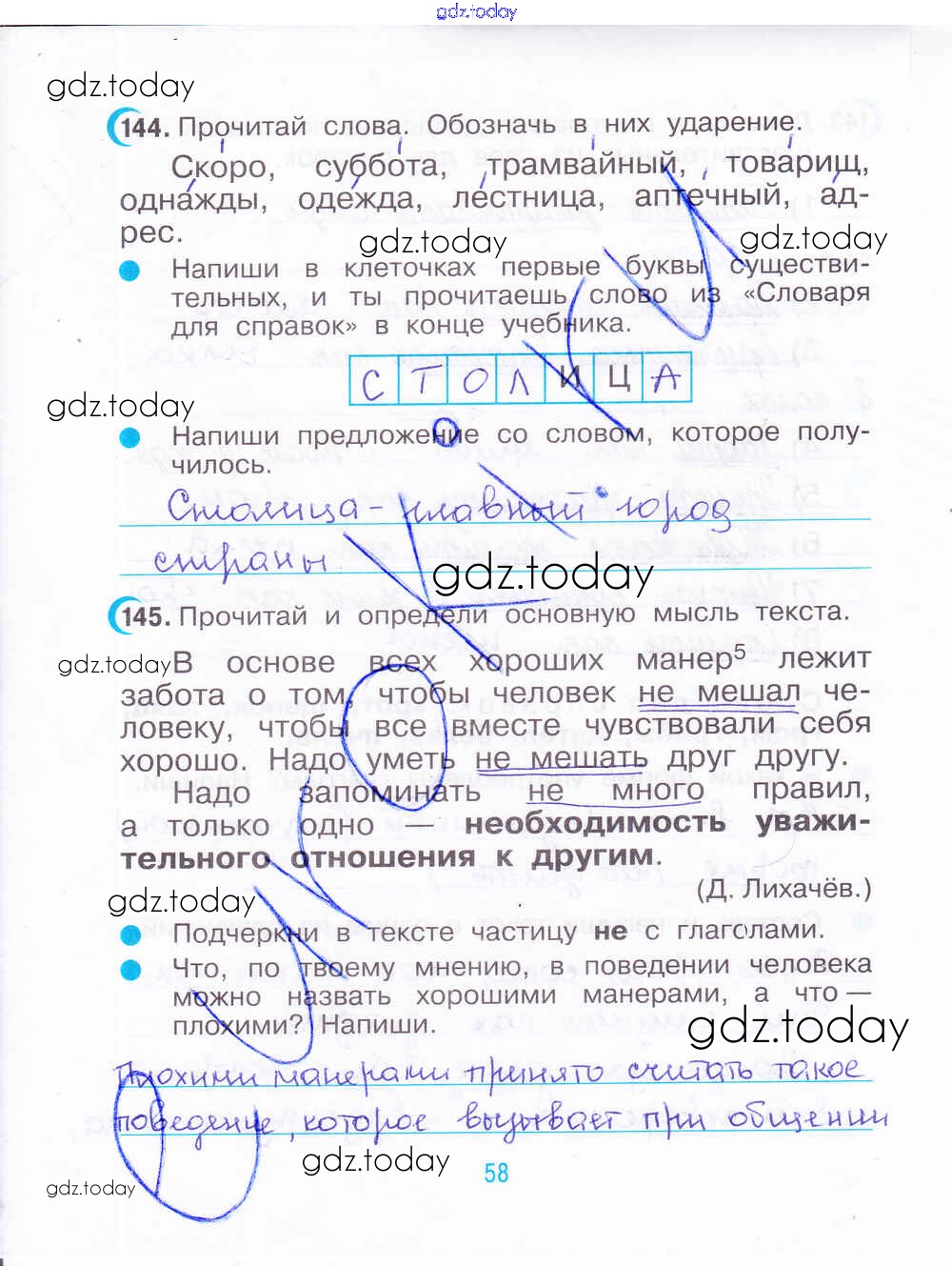 На страницах сайта gdz.today вы найдете учебный и вспомогательный материал, направленный на улучшения знаний школьной программы. ГДЗ - онлайн мир знаний Решение. Часть 2. Страницы 58 Рабочей тетради по Русскому языку для 3 класса Рамзаева, Савинкина Дрофа 2020