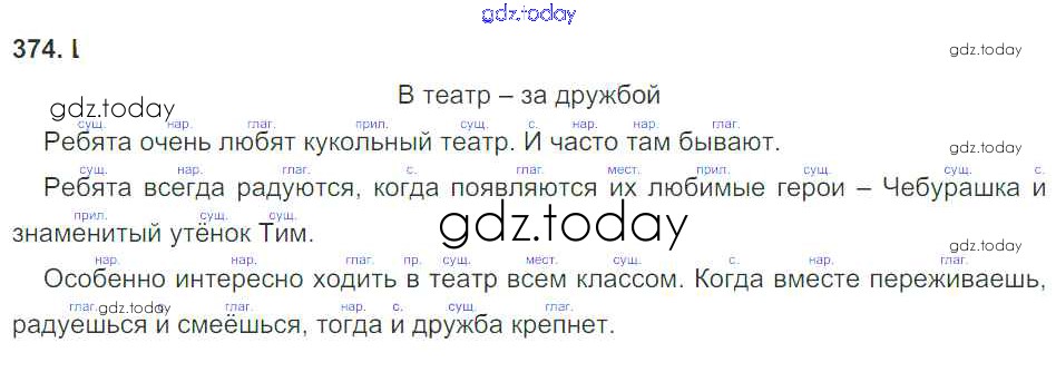 На страницах сайта gdz.today вы найдете учебный и вспомогательный материал, направленный на улучшения знаний школьной программы. ГДЗ - онлайн мир знаний Упражнения 374 Учебнику по Русскому языку для 3 класса Рамзаева Дрофа Ритм 2016