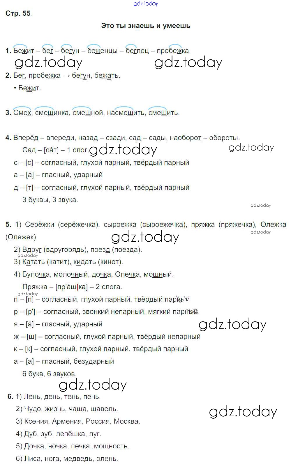 На страницах сайта gdz.today вы найдете учебный и вспомогательный материал, направленный на улучшения знаний школьной программы. ГДЗ - онлайн мир знаний Знаешь, умеешь Решение к части 1. Упражнения стр.55 Учебнику по Русскому языку для 3 класса Бунеев, Бунеева Баласс Школа 2100 2015