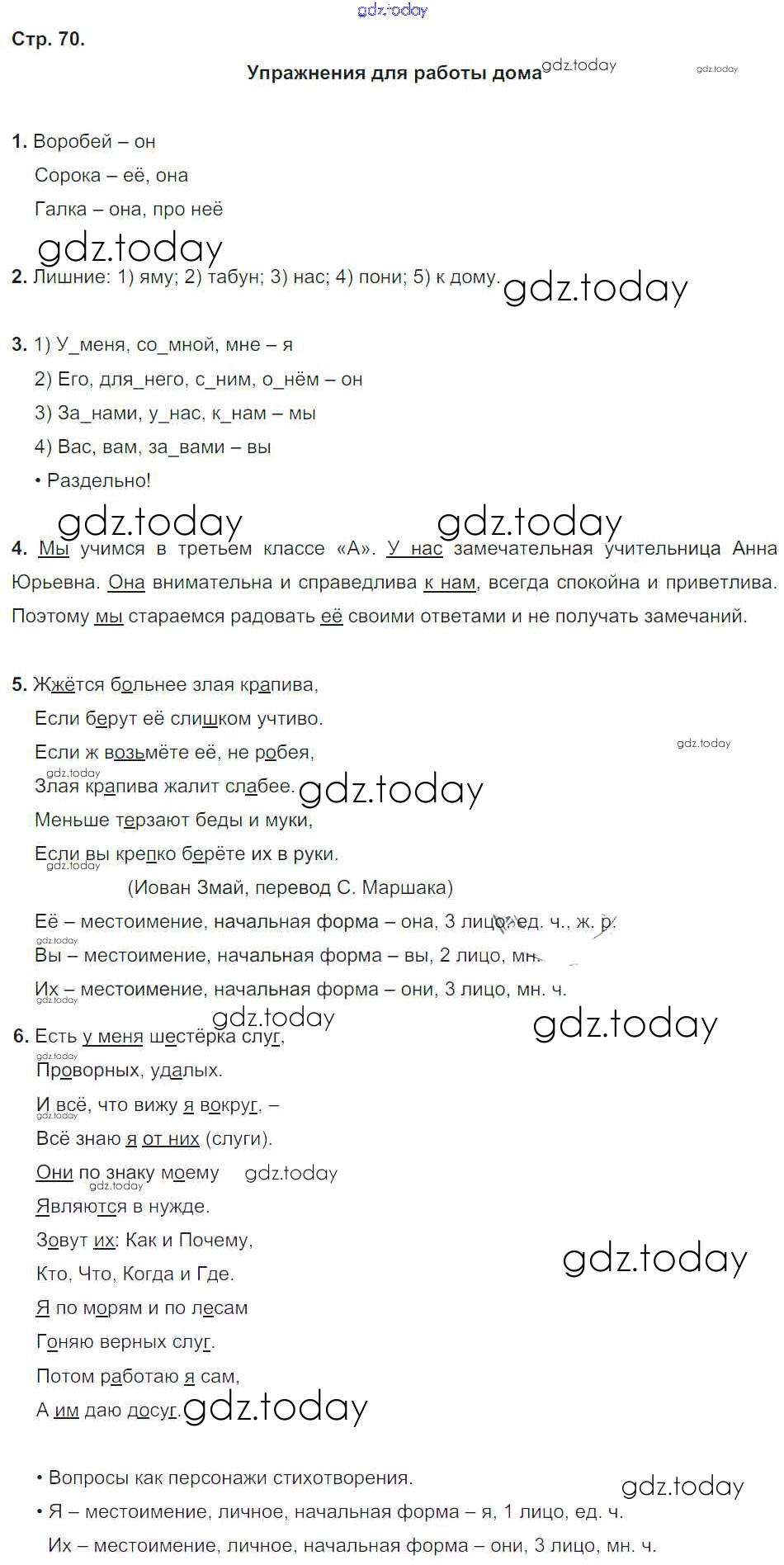 На страницах сайта gdz.today вы найдете учебный и вспомогательный материал, направленный на улучшения знаний школьной программы. ГДЗ - онлайн мир знаний Упражнения для работы дома Решение к части 2. Упражнения стр.70 Учебнику по Русскому языку для 3 класса Бунеев, Бунеева Баласс Школа 2100 2015