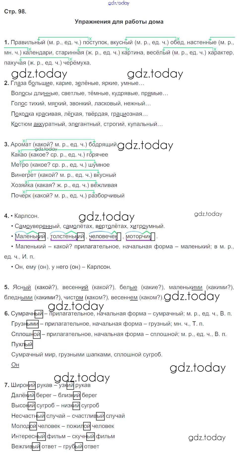 На страницах сайта gdz.today вы найдете учебный и вспомогательный материал, направленный на улучшения знаний школьной программы. ГДЗ - онлайн мир знаний Упражнения для работы дома Решение к части 2. Упражнения стр.98 Учебнику по Русскому языку для 3 класса Бунеев, Бунеева Баласс Школа 2100 2015
