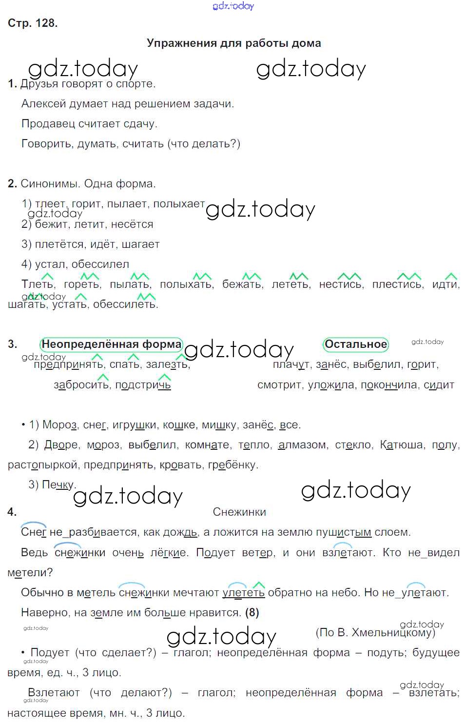 На страницах сайта gdz.today вы найдете учебный и вспомогательный материал, направленный на улучшения знаний школьной программы. ГДЗ - онлайн мир знаний Упражнения для работы дома Решение к части 2. Упражнения стр.128 Учебнику по Русскому языку для 3 класса Бунеев, Бунеева Баласс Школа 2100 2015