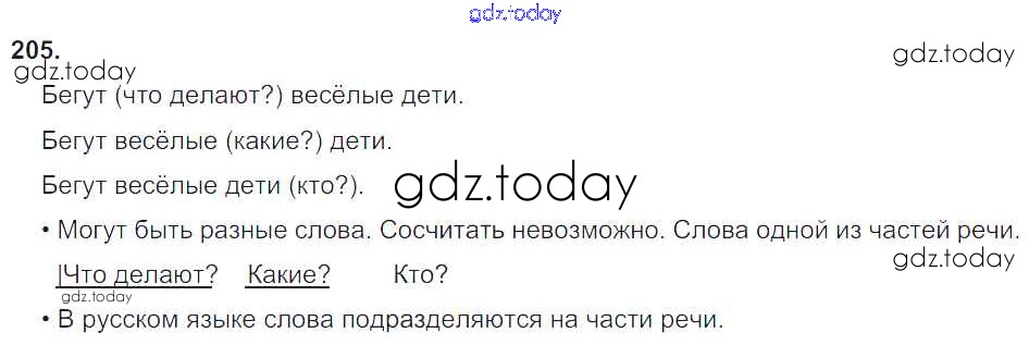 На страницах сайта gdz.today вы найдете учебный и вспомогательный материал, направленный на улучшения знаний школьной программы. ГДЗ - онлайн мир знаний Решение к части 2. Упражнения 205 Учебнику по Русскому языку для 3 класса Бунеев, Бунеева Баласс Школа 2100 2015