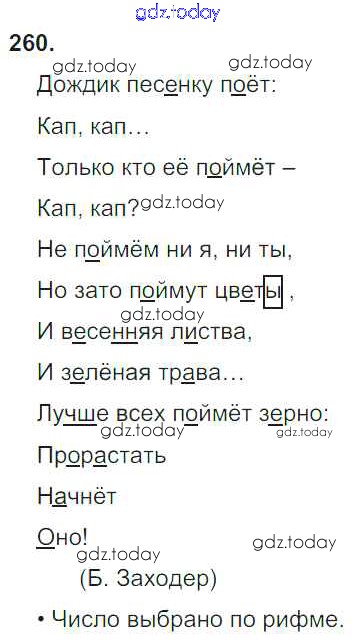 На страницах сайта gdz.today вы найдете учебный и вспомогательный материал, направленный на улучшения знаний школьной программы. ГДЗ - онлайн мир знаний Решение к части 2. Упражнения 260 Учебнику по Русскому языку для 3 класса Бунеев, Бунеева Баласс Школа 2100 2015