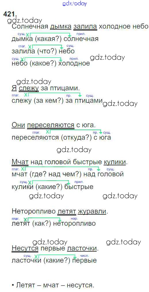 На страницах сайта gdz.today вы найдете учебный и вспомогательный материал, направленный на улучшения знаний школьной программы. ГДЗ - онлайн мир знаний Решение к части 2. Упражнения 421 Учебнику по Русскому языку для 3 класса Бунеев, Бунеева Баласс Школа 2100 2015